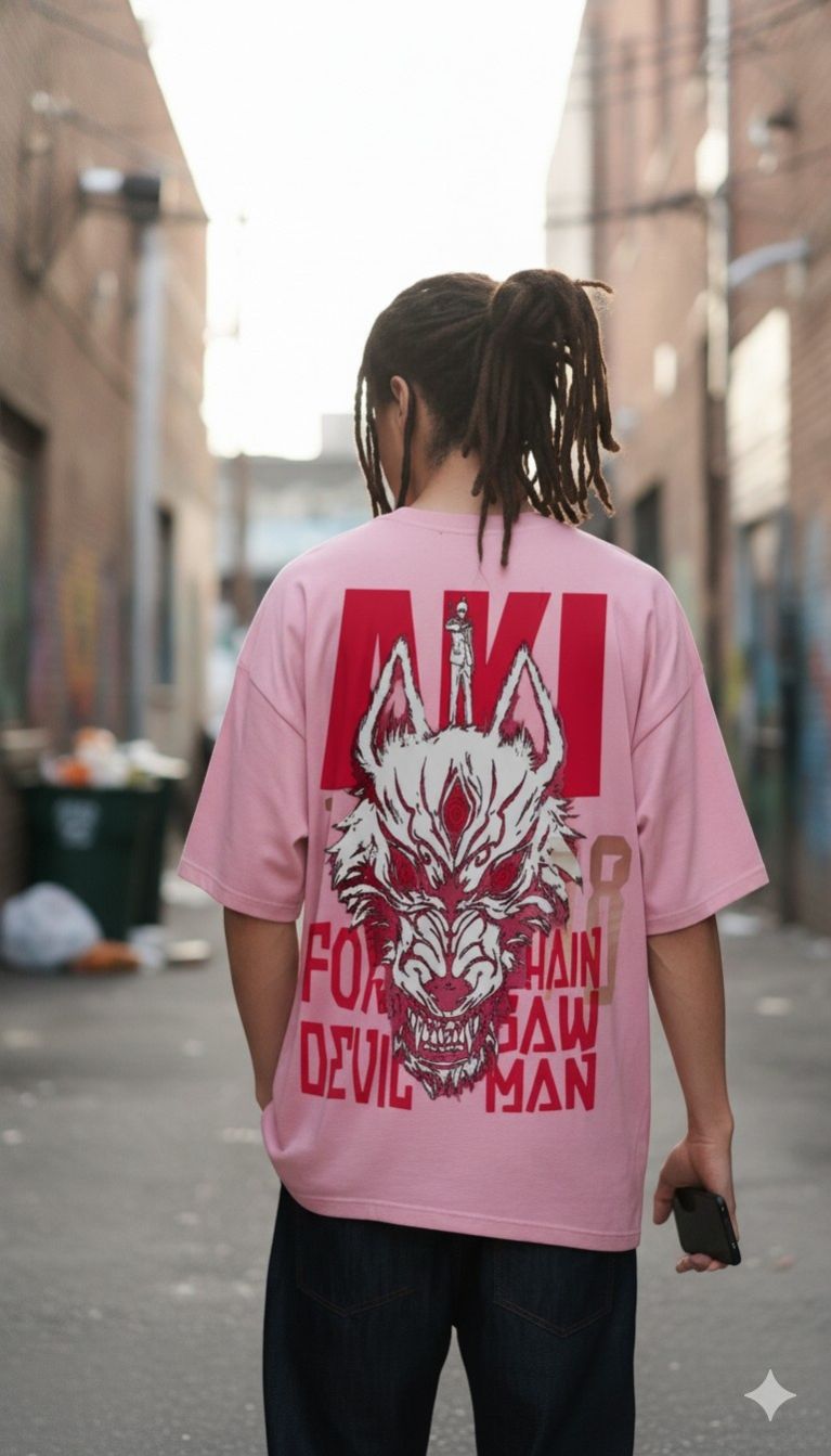 High-Impact Typography: Red graphic elements with text like “FOX DEVIL” and “CHAINSAW MAN” enhance its powerful, streetwear appeal.