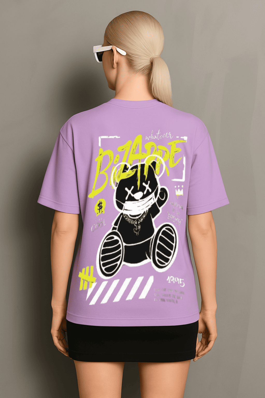 Eye-catching lavender oversized t-shirt with bold street-art-inspired graphic on the back.