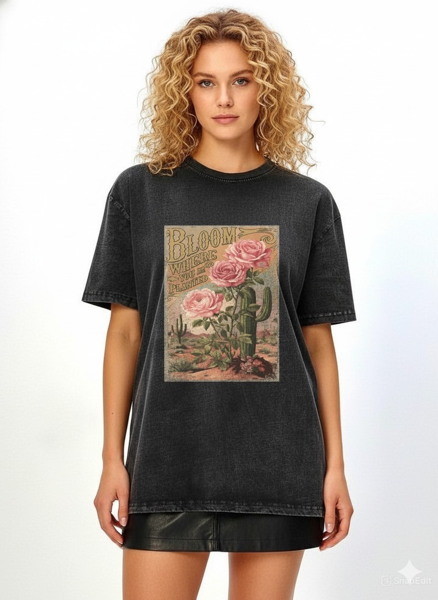 - Inspirational Vintage Graphic: A weathered seed-packet style illustration featuring pink roses sprouting from a desert cactus, framed in ornate Western typography with the uplifting mantra "BLOOM WHERE YOU ARE PLANTED" — a poetic reminder of resilience and growth in any environment.