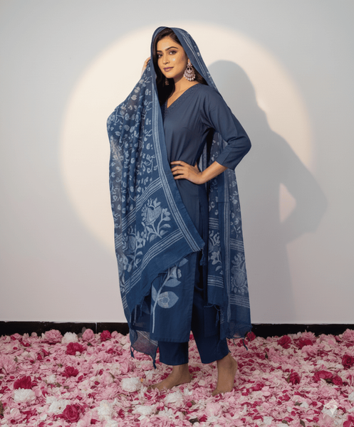 Elevate your ethnic wardrobe with this blue Floral Embroidered Kurta Set featuring intricate floral embroidery that adds timeless elegance. The set includes a finely crafted kurta paired with a matching dupatta, designed to offer both style and comfort. Ideal for festive occasions and formal gatherings, this ensemble balances traditional craftsmanship with contemporary appeal, ensuring a refined and graceful look.