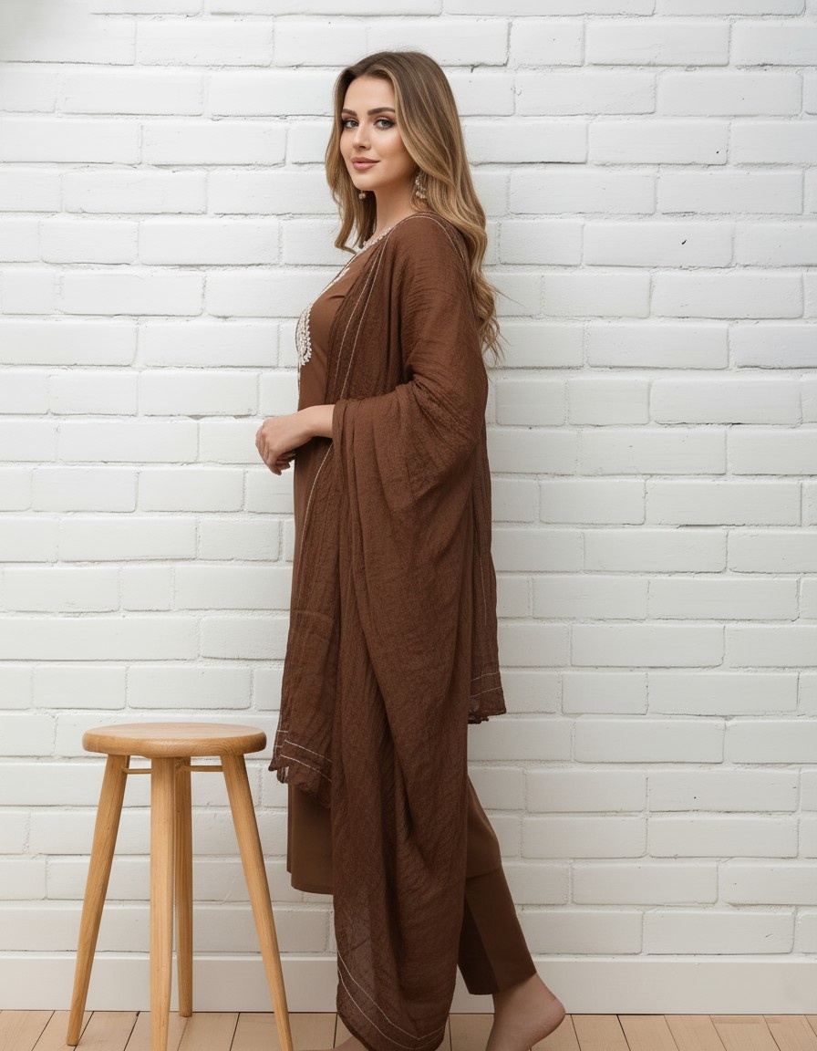 Brown Embroidered Kurta Set with Dupatta for Women