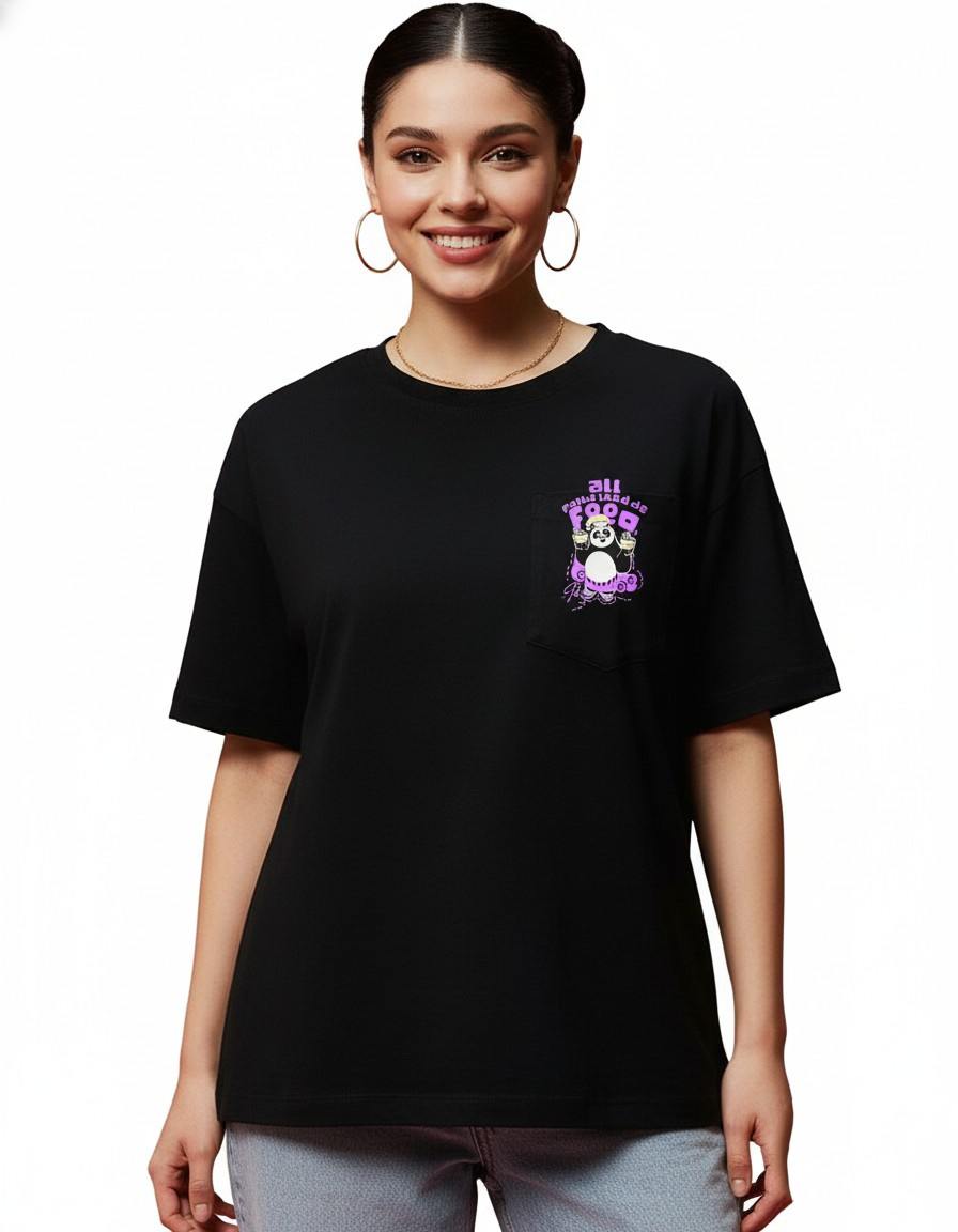 Cute Panda Noodles Graphic Oversized Black T-Shirt – Kawaii Streetwear Style