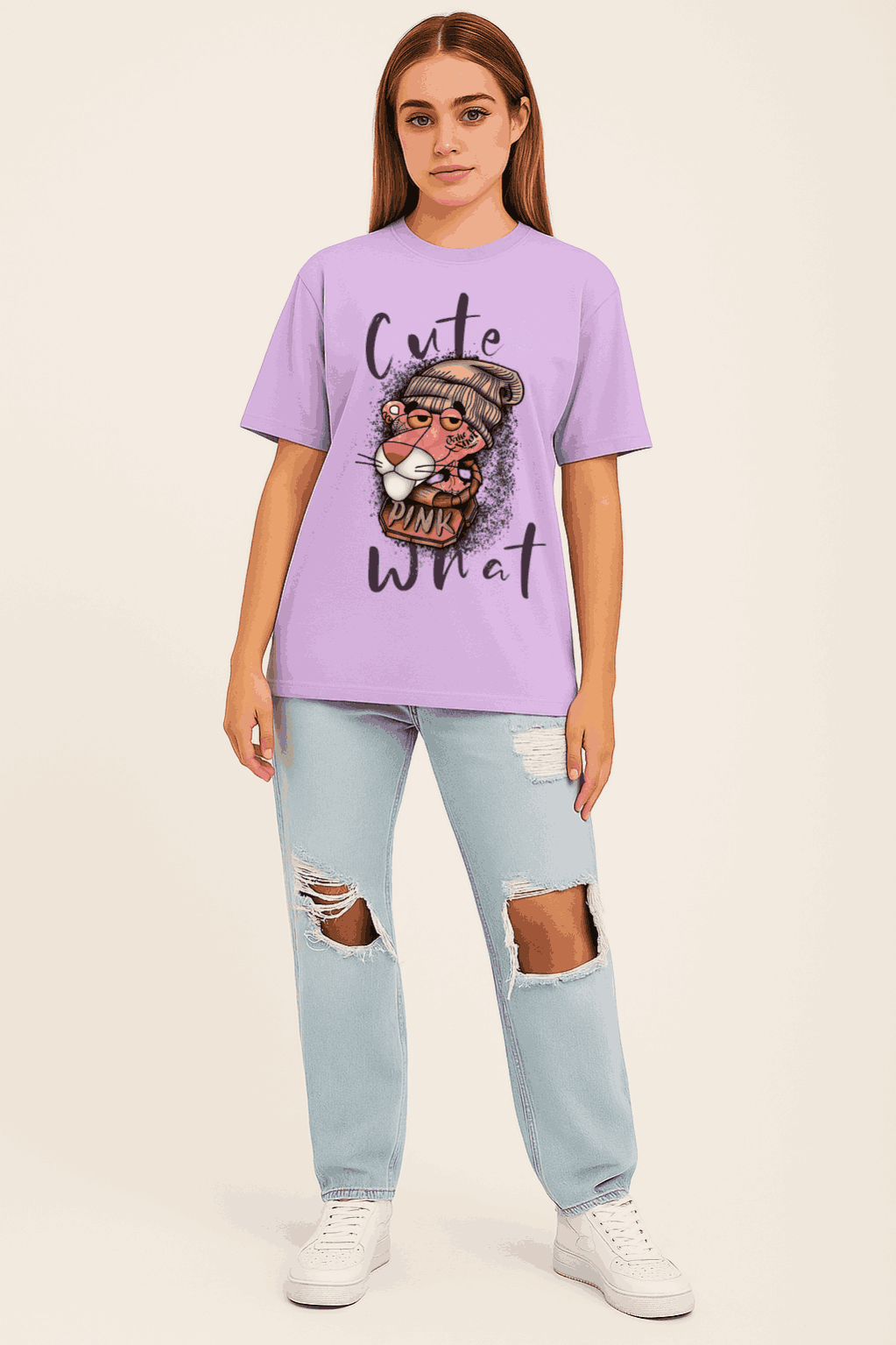 Trendy lavender oversized t-shirt featuring a playful Pink Panther graphic.