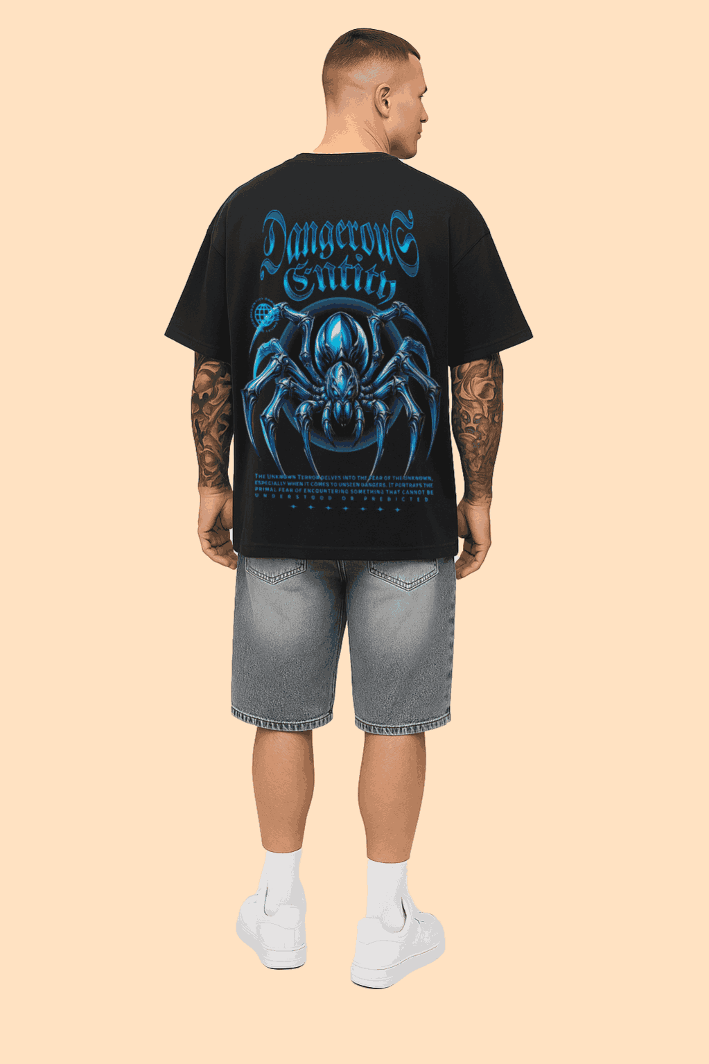 Oversized black t-shirt with bold back graphic featuring a blue, cyber-stylized spider illustration