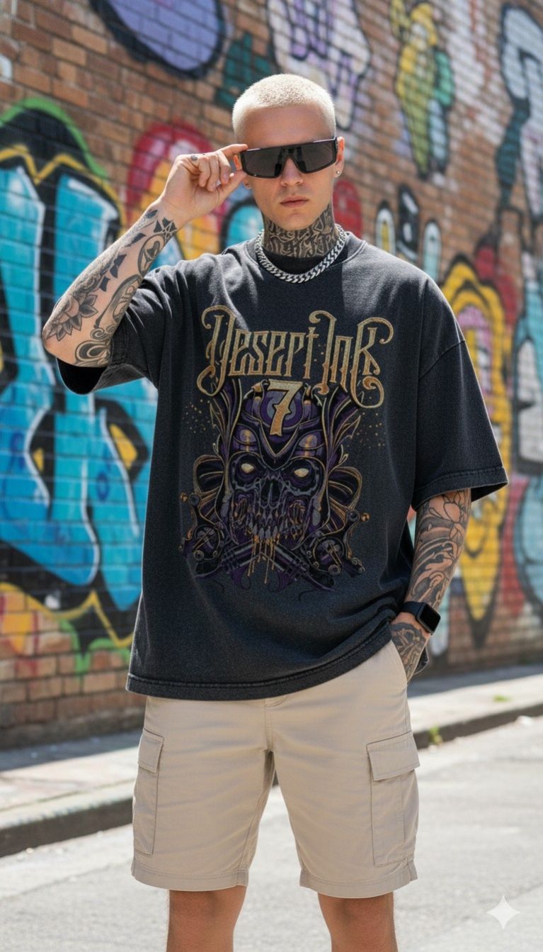 - Striking Graphic Appeal: Dive into the wild side with this "Desert Ink 7: Unleashed" oversized T-shirt, boasting a fierce skull graphic with golden accents and a dark, mystical aura that demands attention.