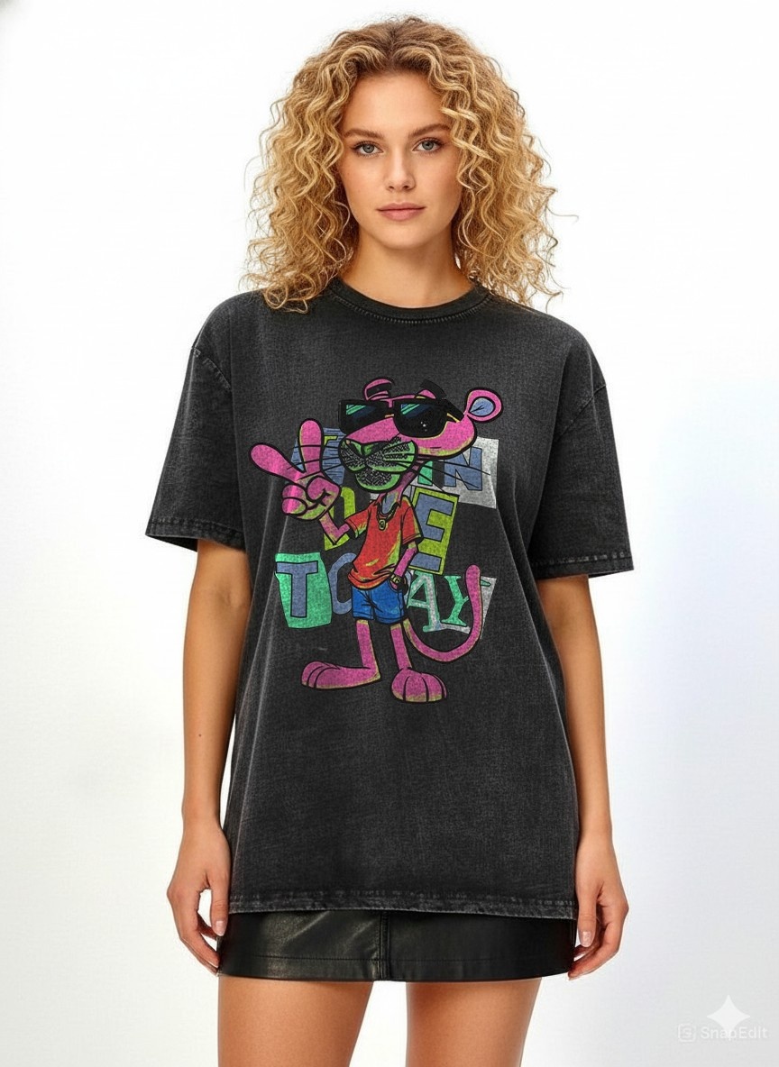 Funky Acid Wash 240 GSM Oversized T-Shirt with Pink Panther