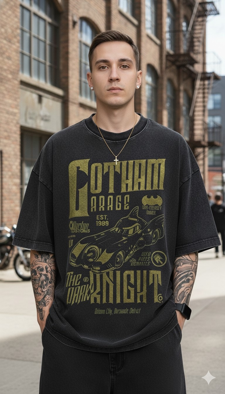 - Iconic Dark Hero Vibe: Cruise into style with the "Gotham Garage: The Dark Knight" oversized T-shirt, featuring a sleek Batmobile and bold yellow text that captures the essence of Gotham’s guardian.