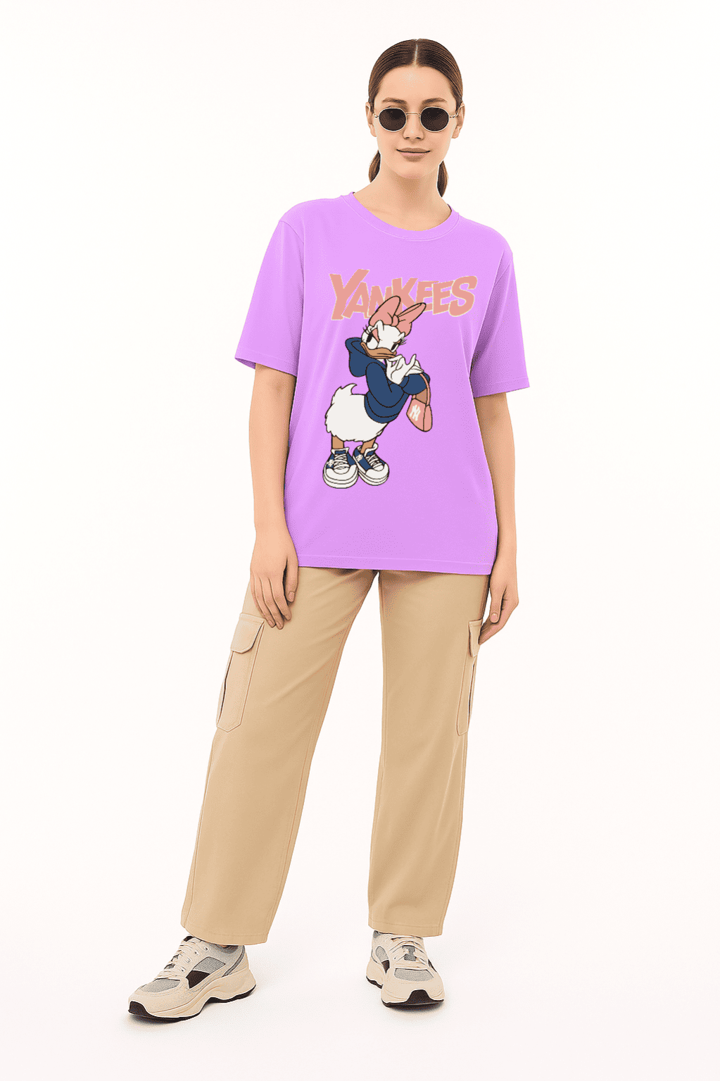 Step out in playful style with this lavender oversized tee featuring Daisy Duck in a Yankees-inspired streetwear look. Crafted from 240 GSM 100% French terry cotton for premium comfort and standout charm.