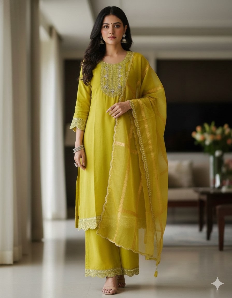 Elegant lime yellow straight-fit kurta set with matching pants and dupatta