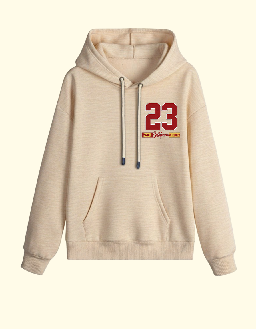 - Bottom banner patch reading "23 California VICTORY" in red script and gold