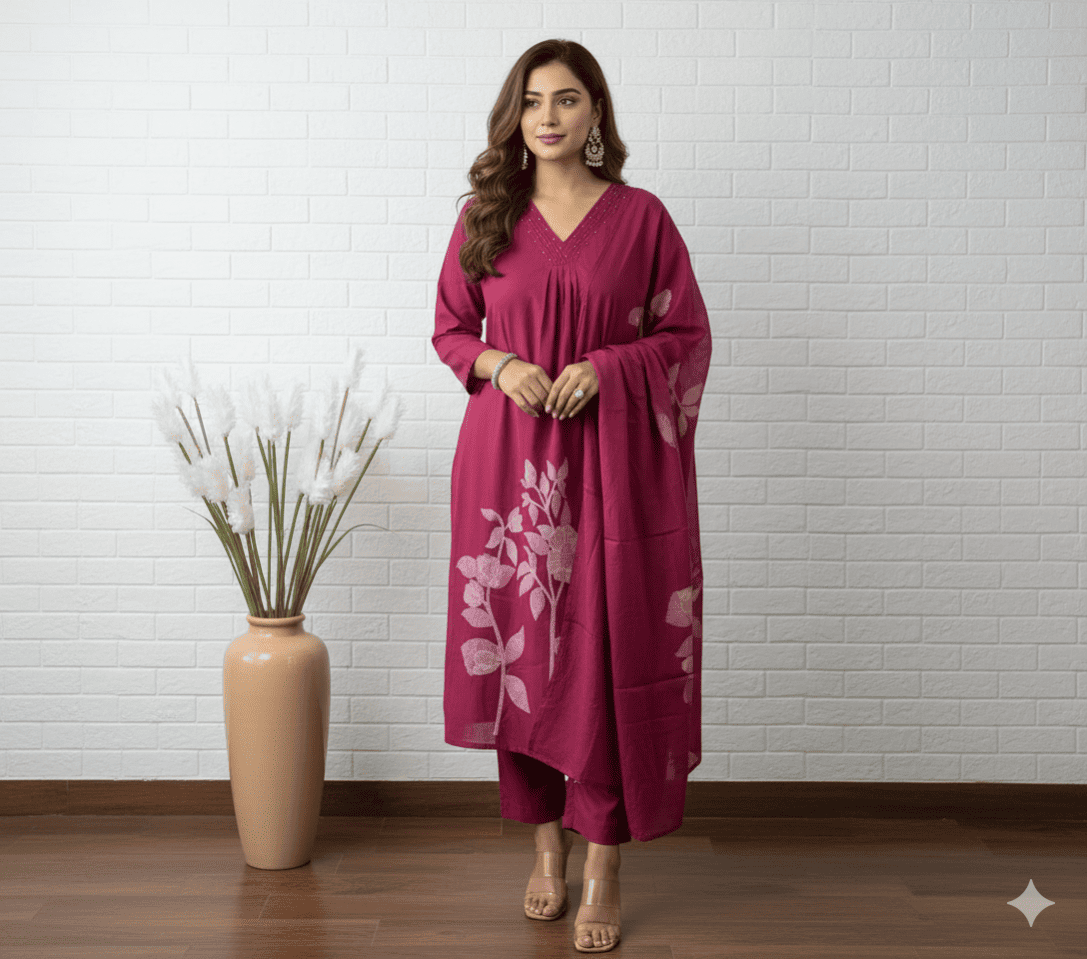 Magenta Floral Embroidered Kurta Set with Dupatta