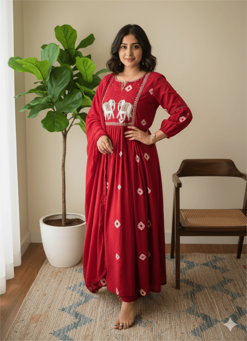 Style: A traditional Indian Anarkali suit set, consisting of a full-length flared kurta, coordinating dupatta (scarf), and possibly matching bottoms (churidar or pants, though not fully visible).