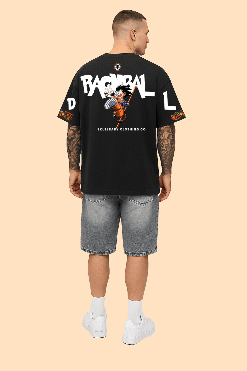 Graphics: Large back print with stylized text and character, small front design for a balanced aesthetic.