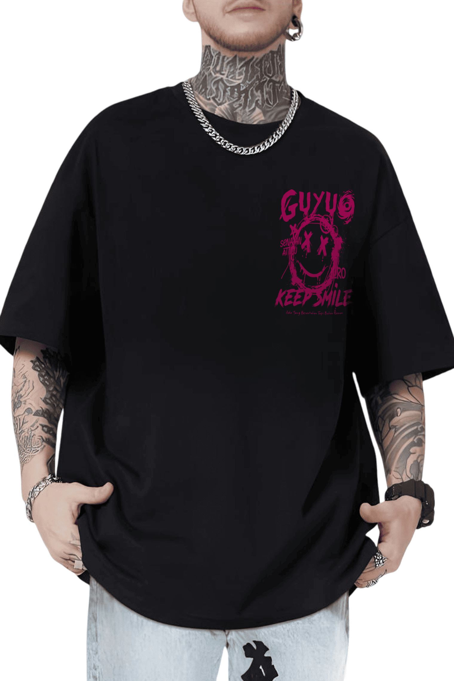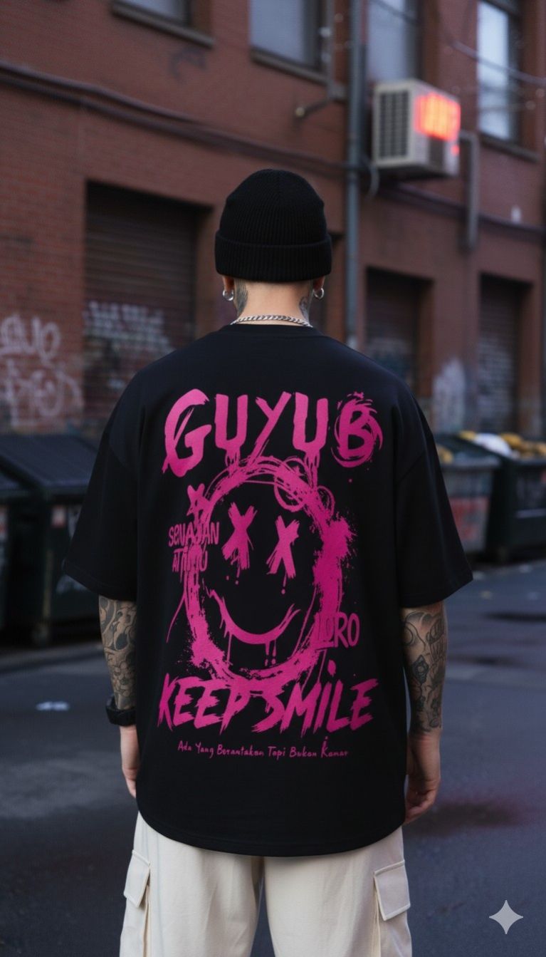 Striking back print with a hand-drawn graffiti smiley face and bold text “GUYUB” and “KEEP SMILE”