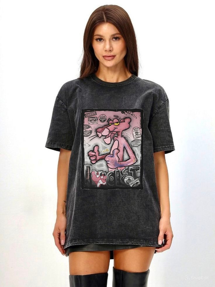 - Edgy Pink Panther Street Art Graphic: The iconic Pink Panther lounges with a sly smirk, finger to lips in a "shh" pose, set against a gritty urban backdrop of spray-paint tags, vintage stamps, and bold "QUIET" lettering — a cheeky blend of retro cartoon and underground graffiti culture.