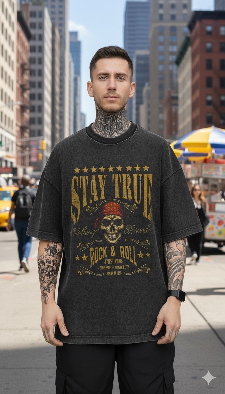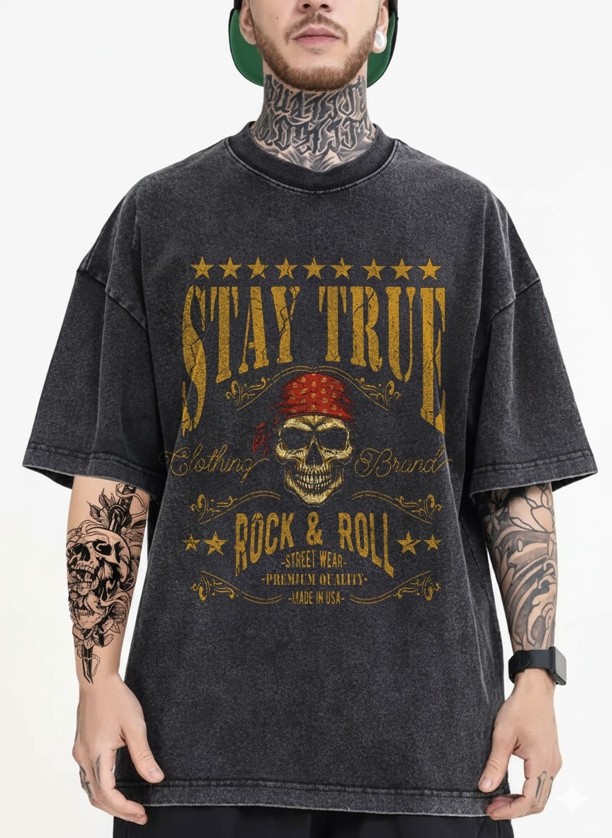 - Unwavering Rock Spirit: Stand tall with the "Stay True: Rock & Roll Legacy" oversized T-shirt, featuring a bold skull with a bandana and red roses, framed by gold stars that embody timeless rock loyalty.