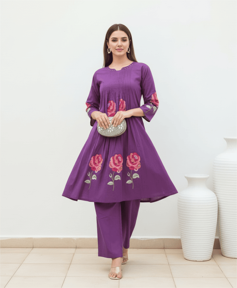 Vibrant Purple Angrakha-Style Kurta Set with Hand-Painted Rose Motifs