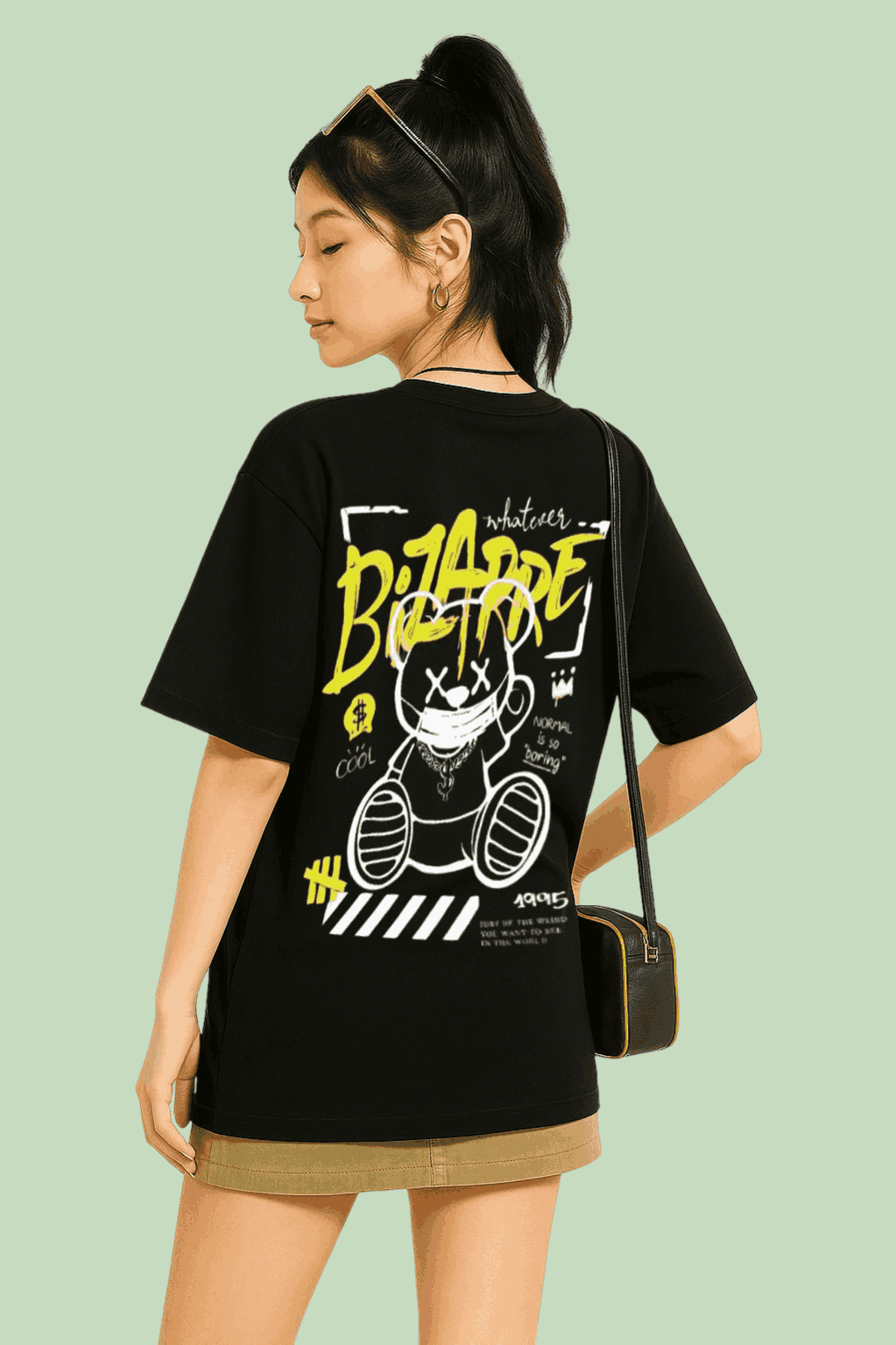 Design: Bold back print featuring a doodle-style cartoon bear with X eyes, bandana, and face mask