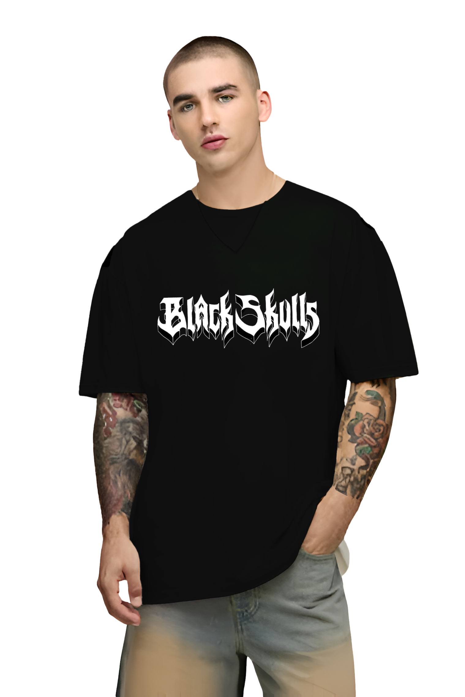 Bold “BLACK SKULLS” text in gothic heavy-metal style font across the upper back