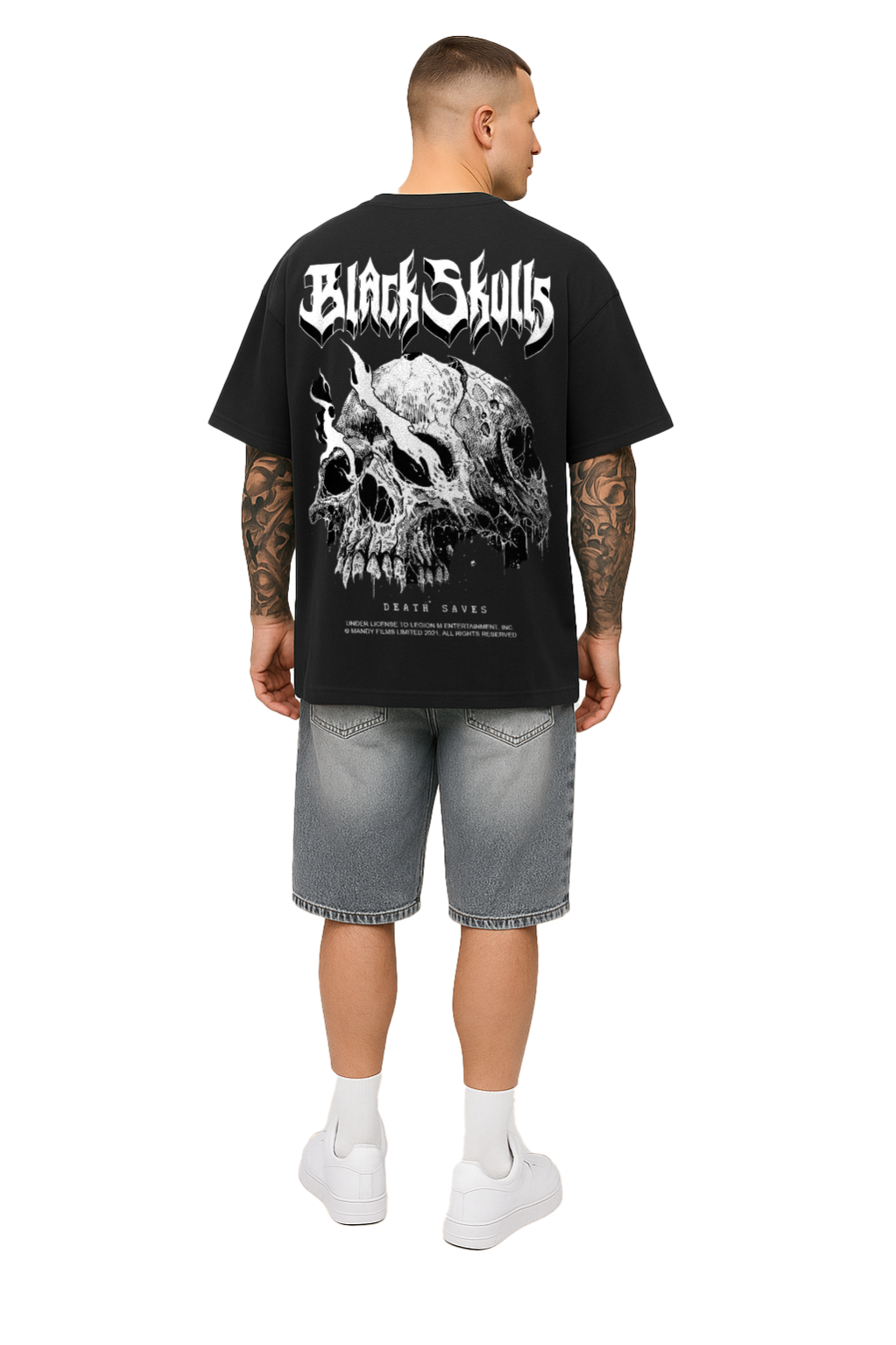 Statement black oversized t-shirt featuring a detailed monochrome skull artwork
