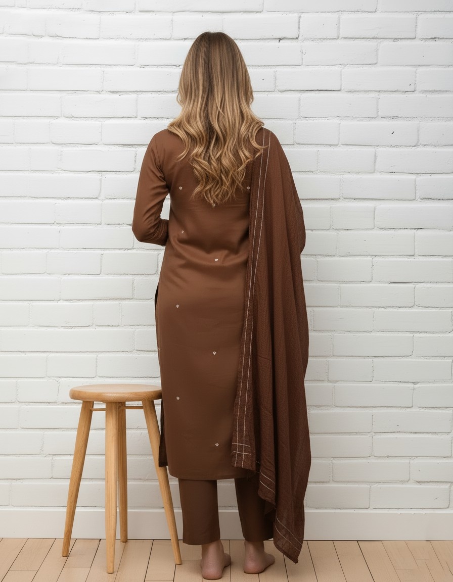 Stylish brown embroidered kurta set for women designed for a sophisticated ethnic look.