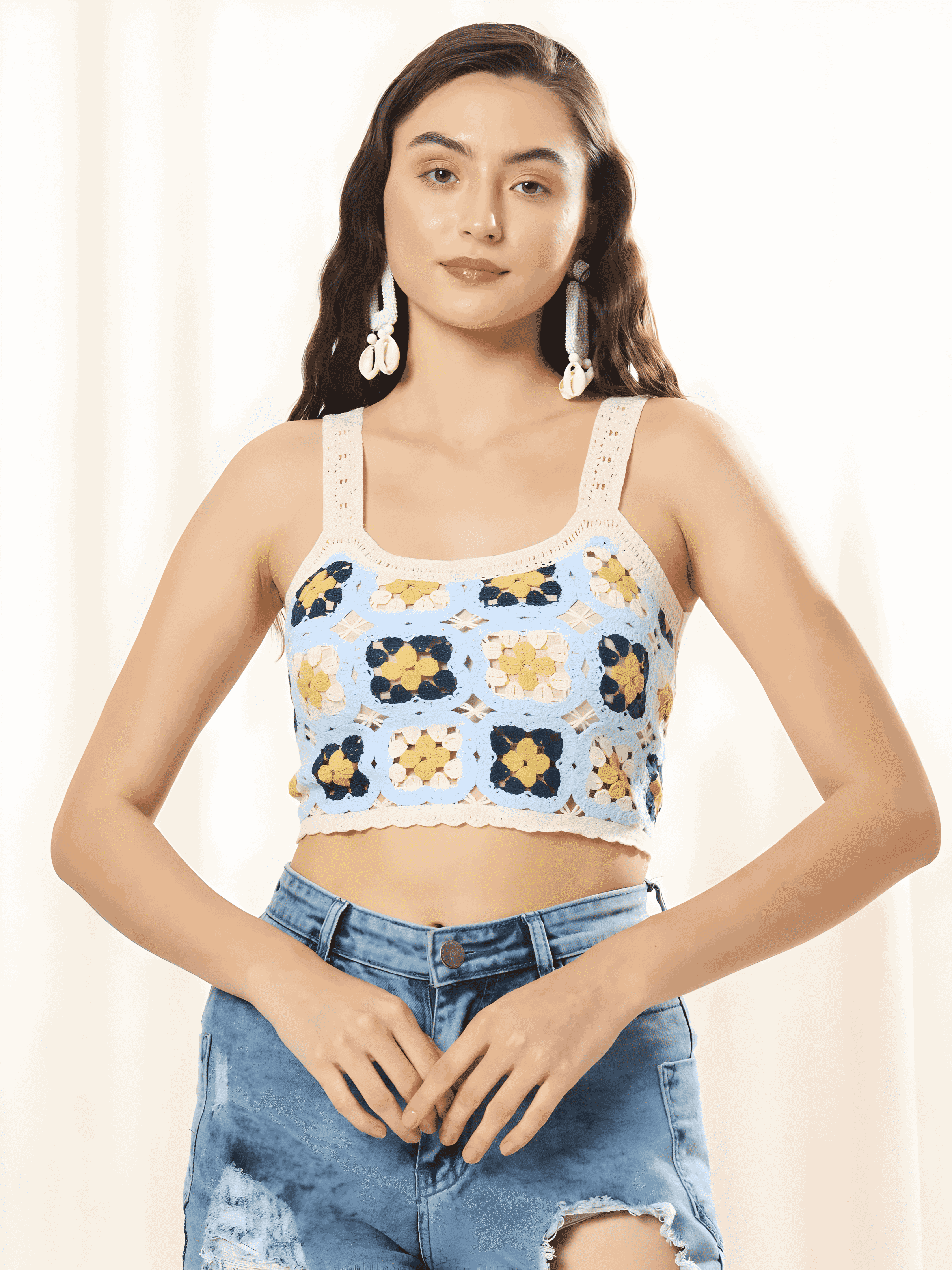 - Top: Handcrafted crochet crop top with square floral patterns in soft blue, cream, and yellow tones.