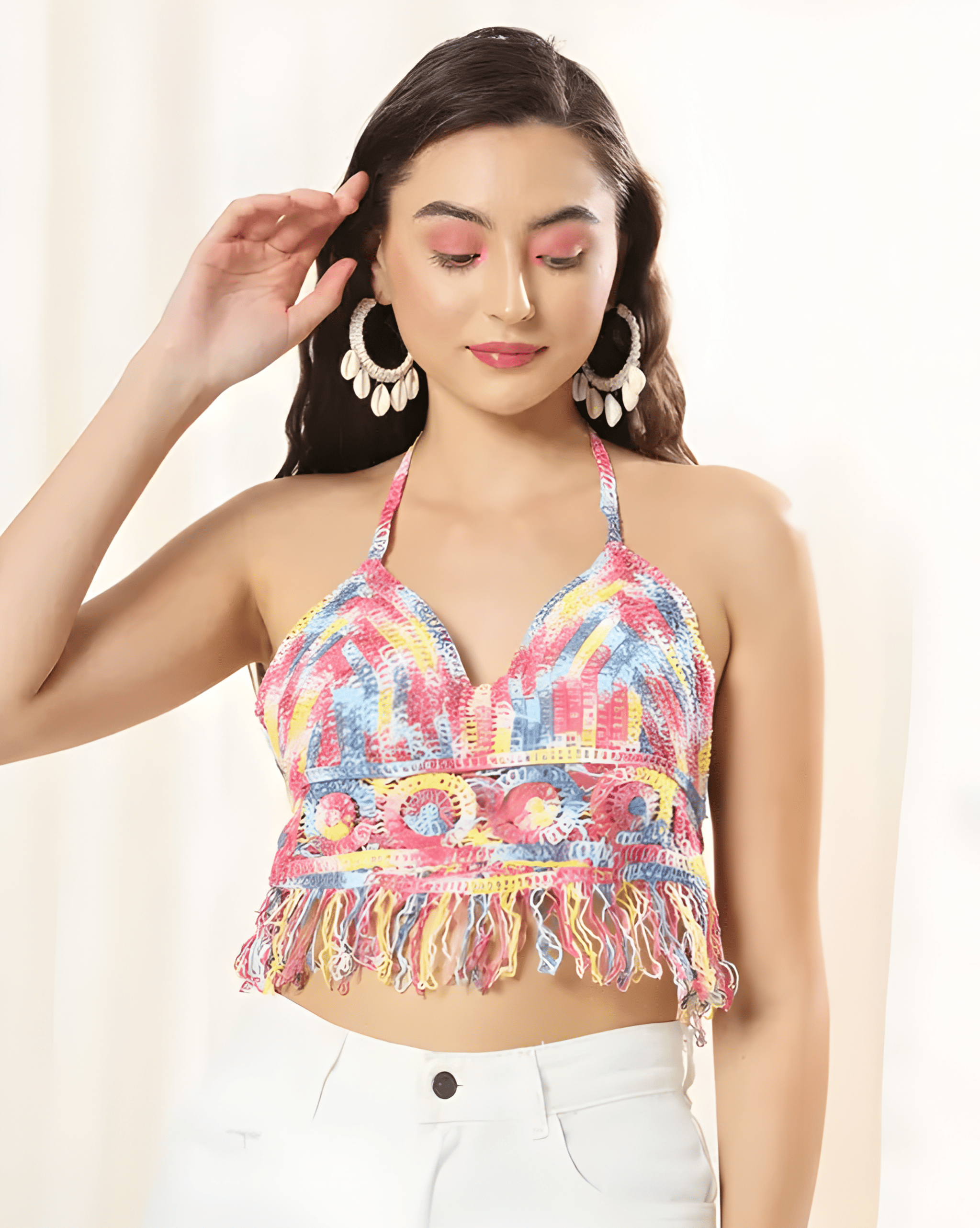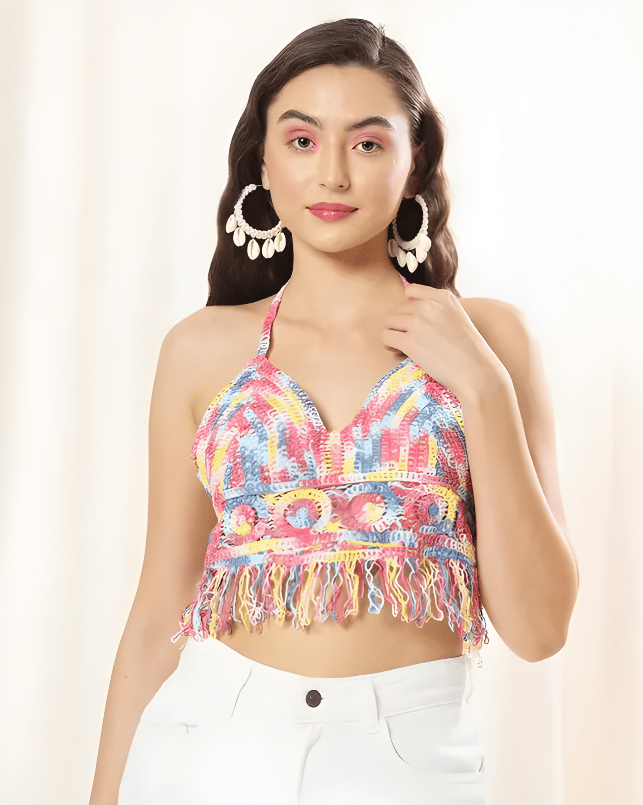 - Top: Vibrant multicolor crochet halter top with intricate patterns and playful fringe detailing.