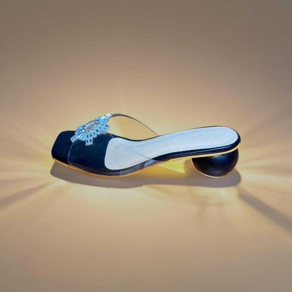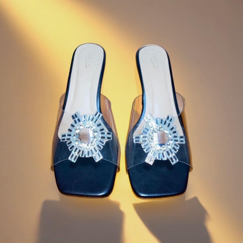 - Material: Glossy black patent sole with a clear PVC strap for an airy, minimalist feel