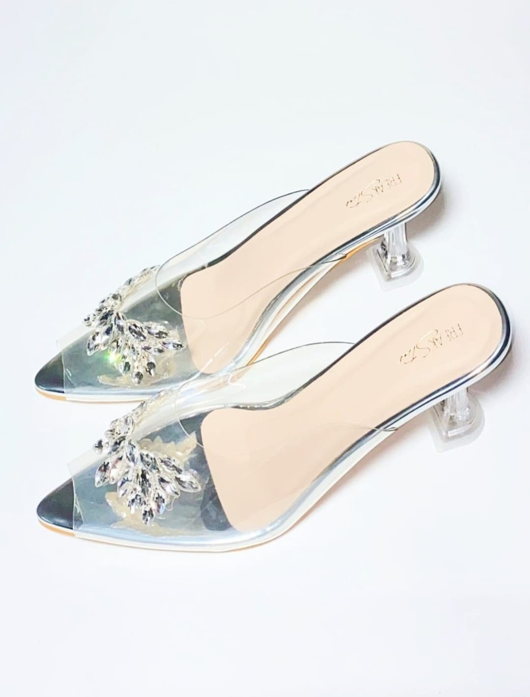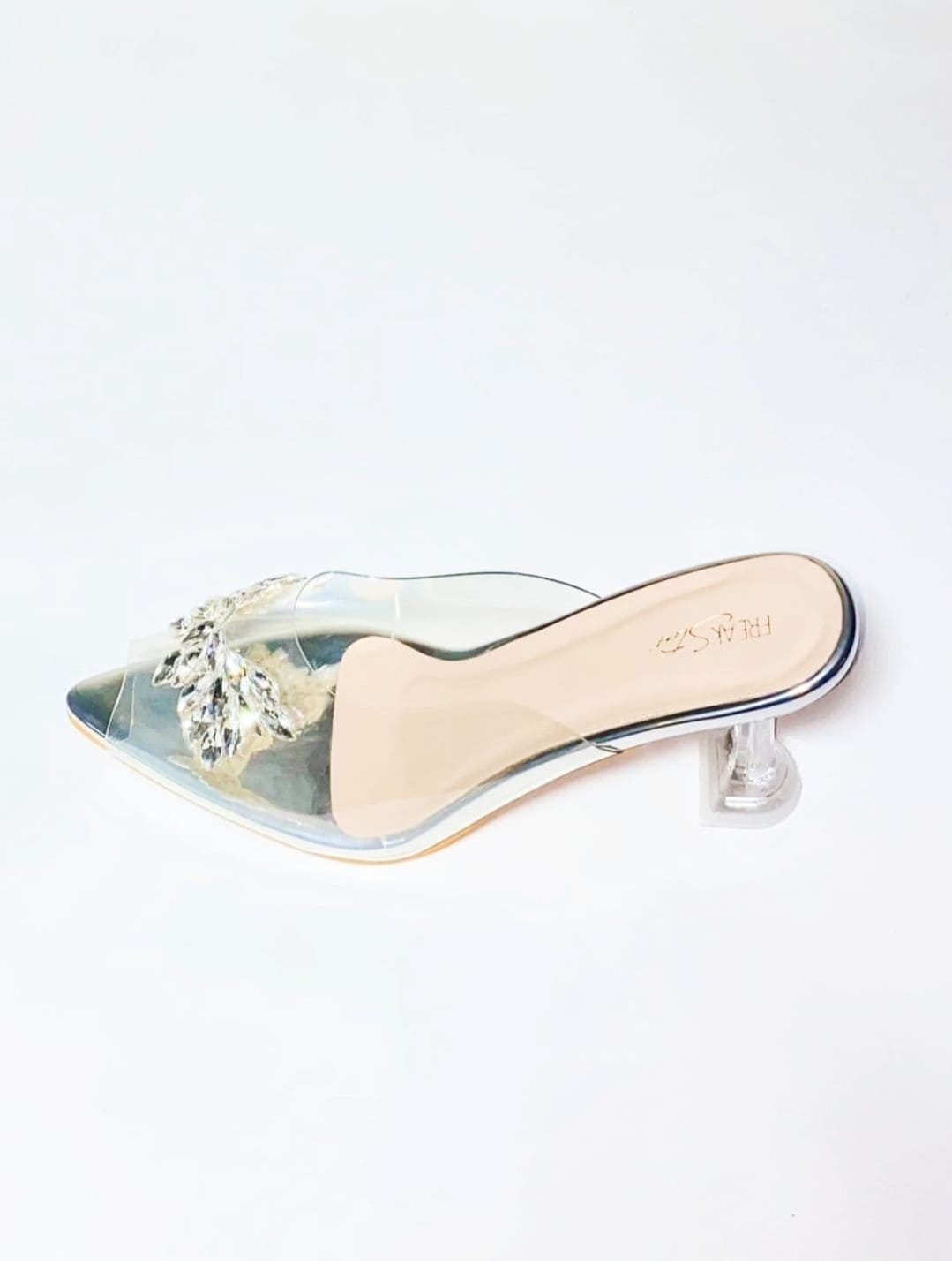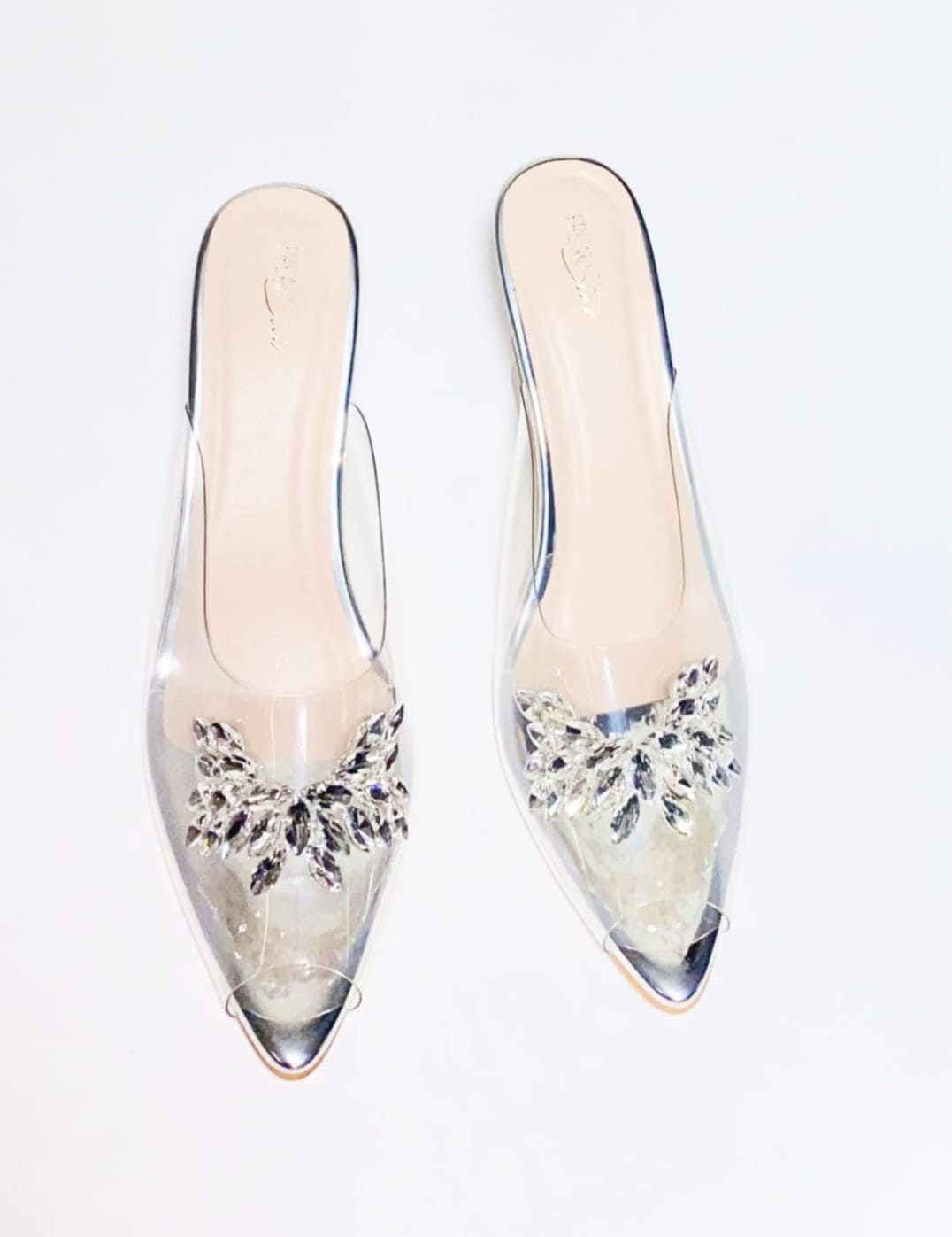 - Elegant pointed-toe transparent heels for a modern, Cinderella-inspired look