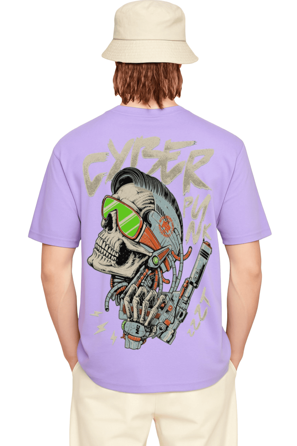 Back Graphic: High-detail cyberpunk skull with neon and robotic elements