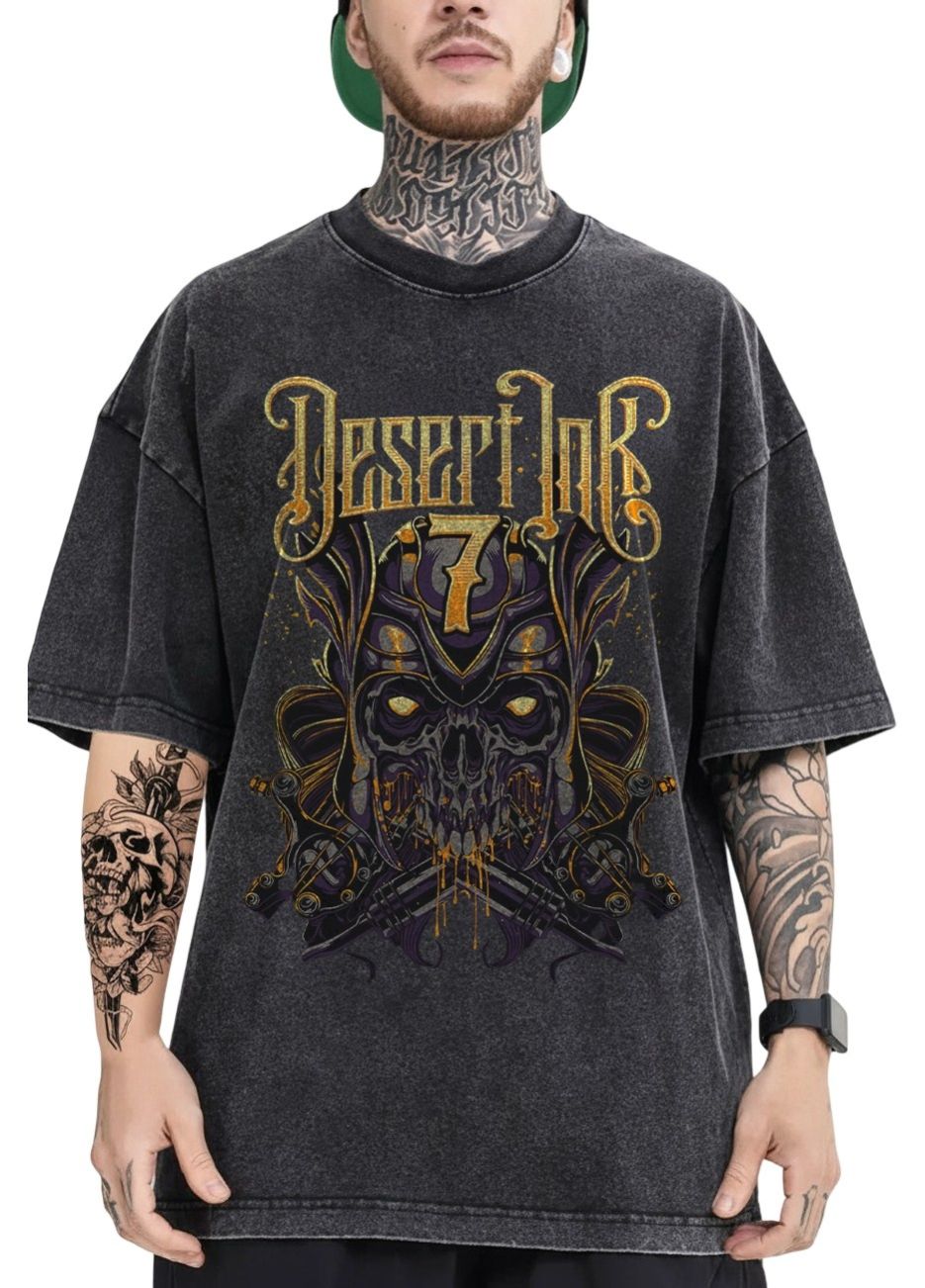 - Striking Graphic Appeal: Dive into the wild side with this "Desert Ink 7: Unleashed" oversized T-shirt, boasting a fierce skull graphic with golden accents and a dark, mystical aura that demands attention.