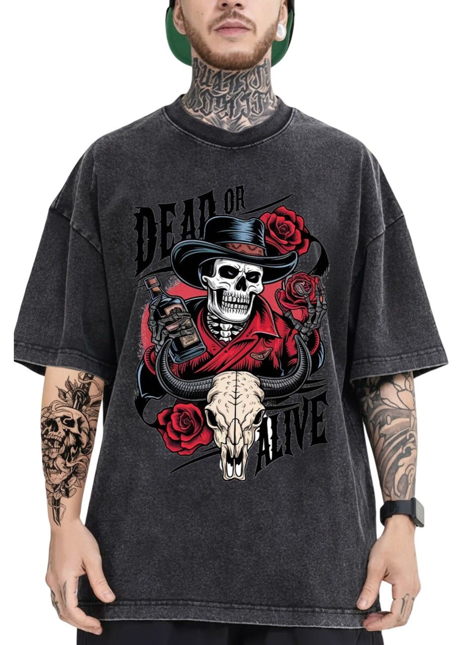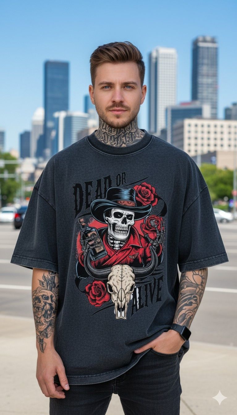 - Complemented by intricate tattoo designs on the sleeves and neck, featuring detailed skull and floral patterns, enhancing the edgy, rebellious aesthetic.