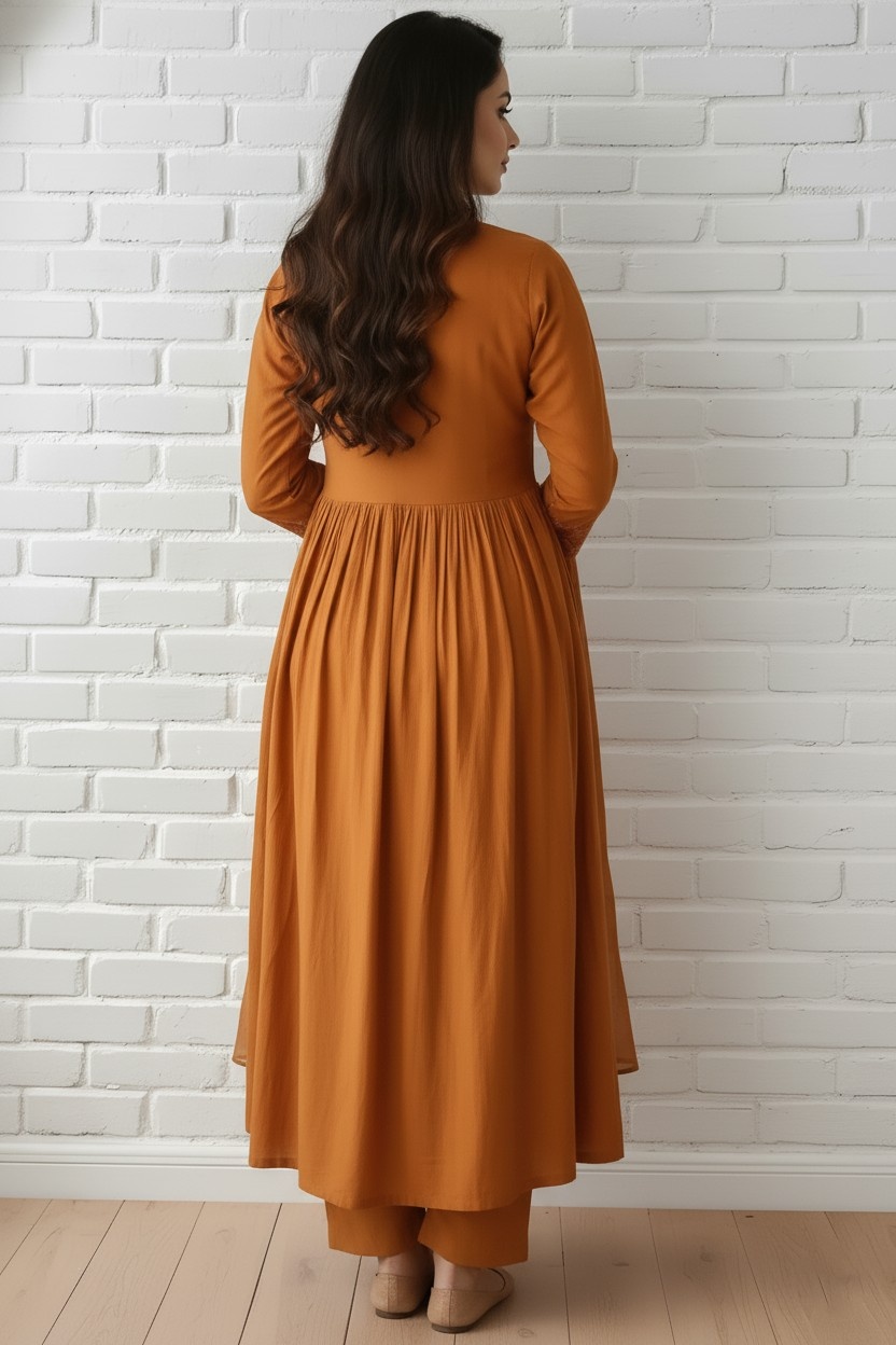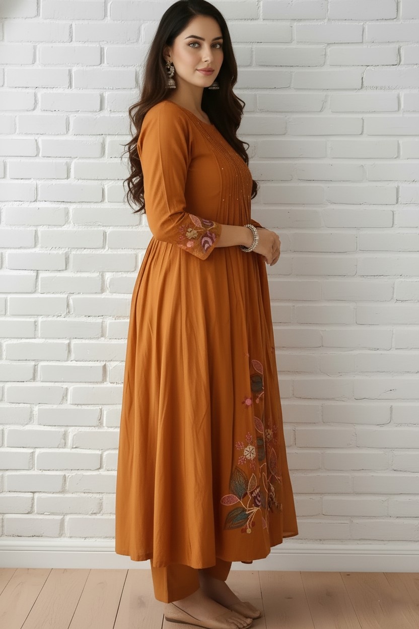 Elegant mustard kurta set for women featuring beautiful floral embroidery near the hemline.