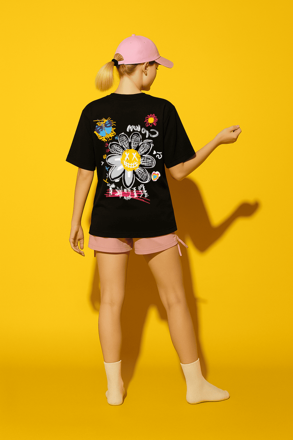 Design: Artistic graffiti-style flower and sketch motifs on the back