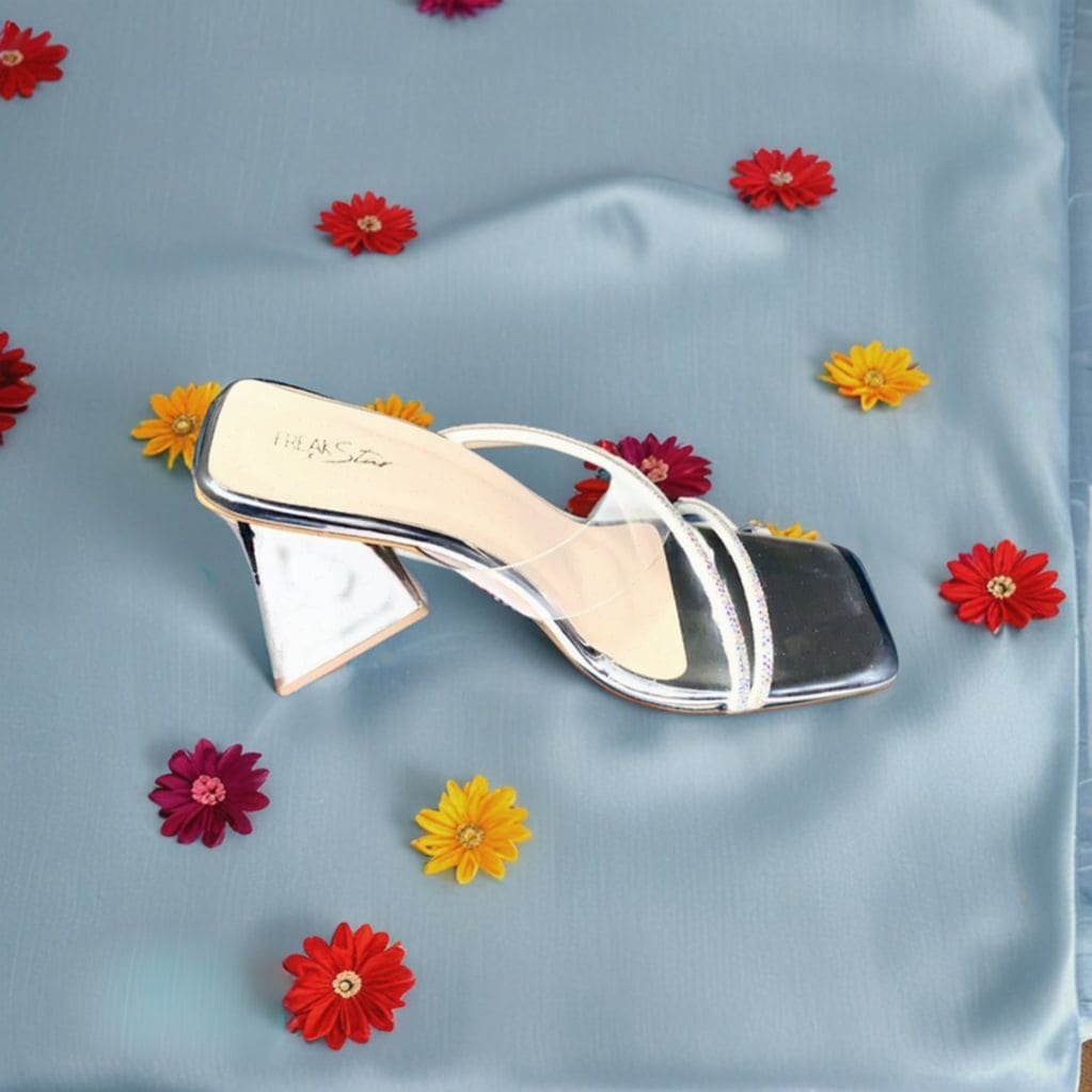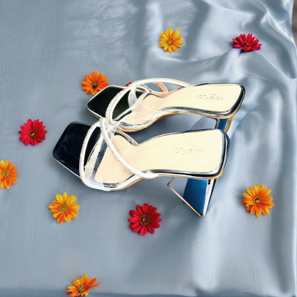 - Straps: Transparent and silver beaded crisscross straps for a chic touch
