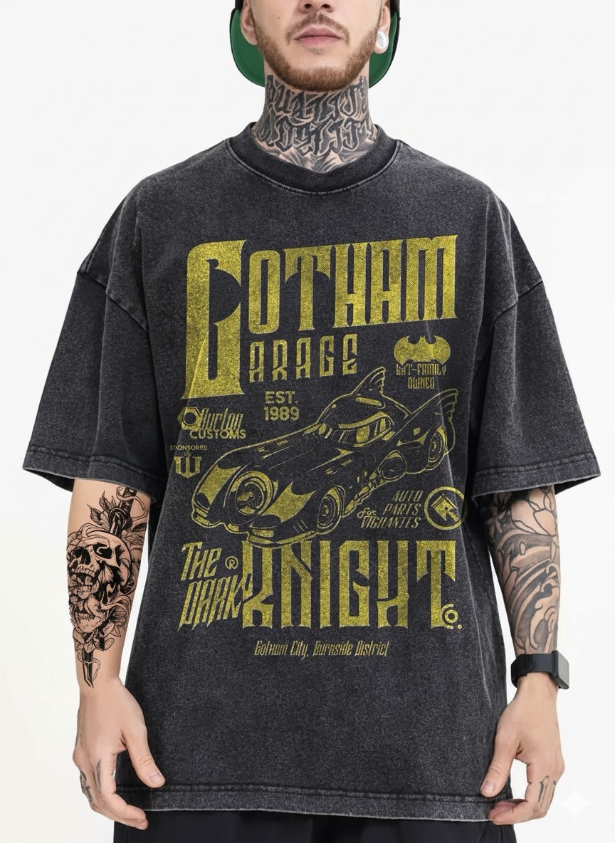 - Iconic Dark Hero Vibe: Cruise into style with the "Gotham Garage: The Dark Knight" oversized T-shirt, featuring a sleek Batmobile and bold yellow text that captures the essence of Gotham’s guardian.