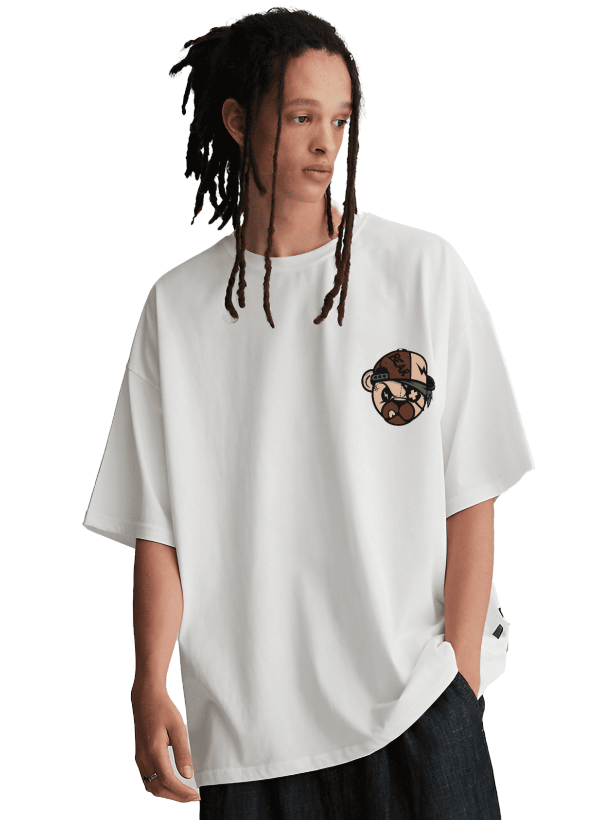 Back graphic features a rugged teddy bear with sunglasses and stitched design