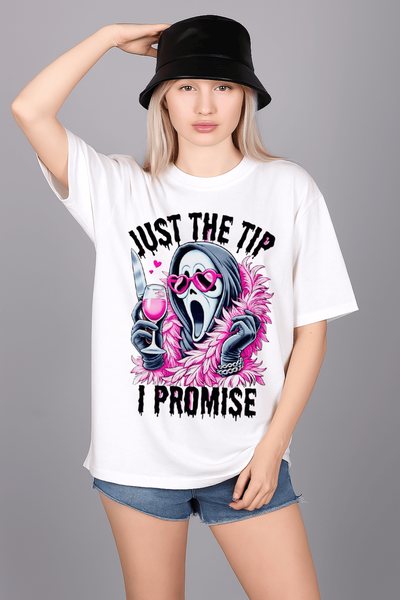Bold text: “JUST THE TIP I PROMISE” for a fun and playful statement