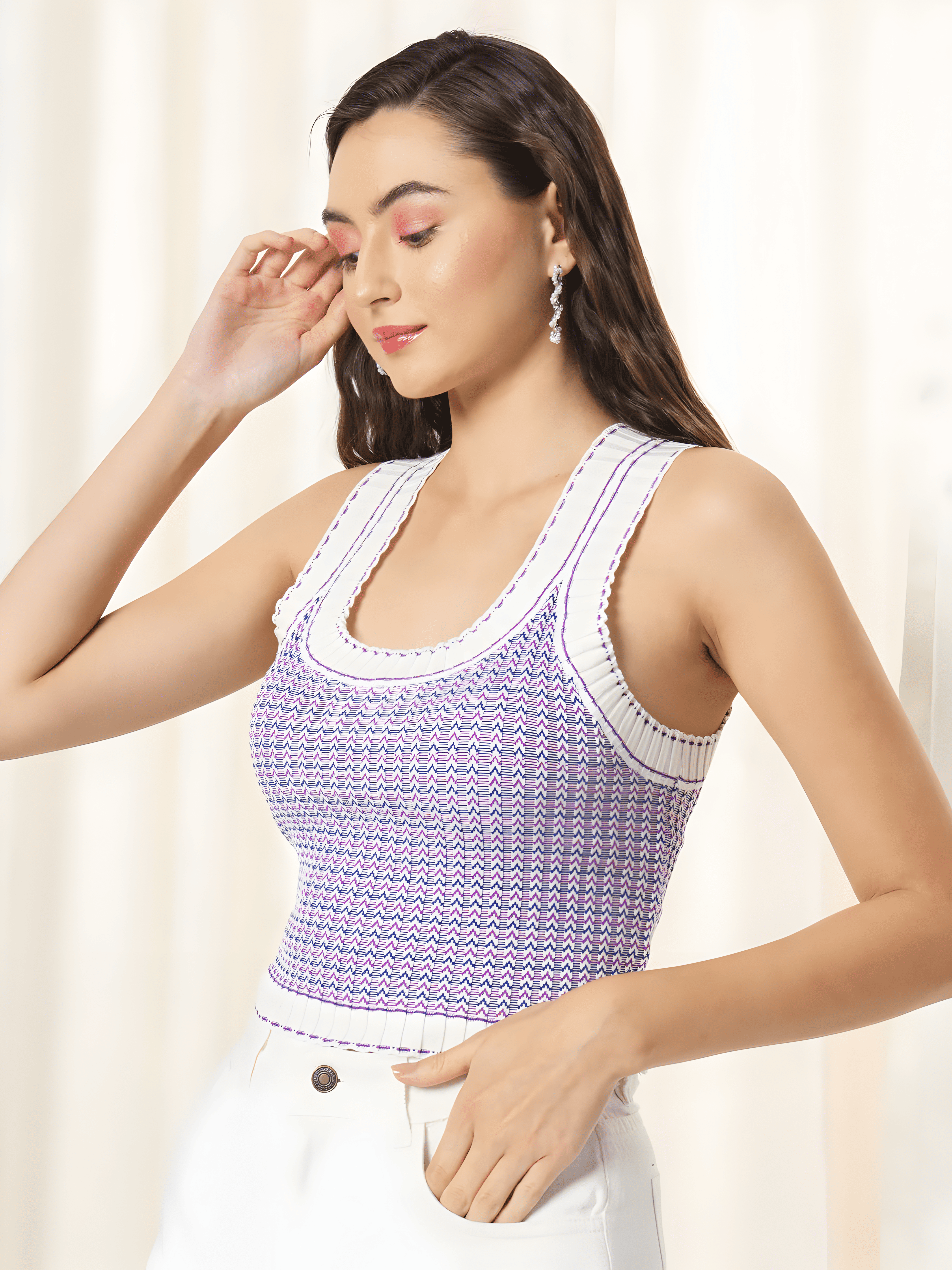 - Top: Lavender and white knit crop top with a scoop neckline and wide straps.