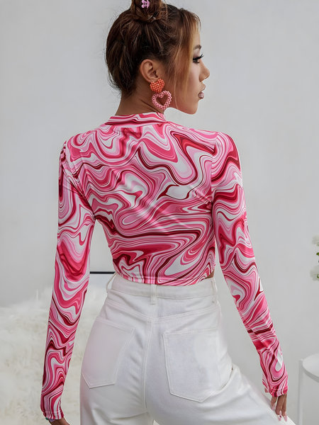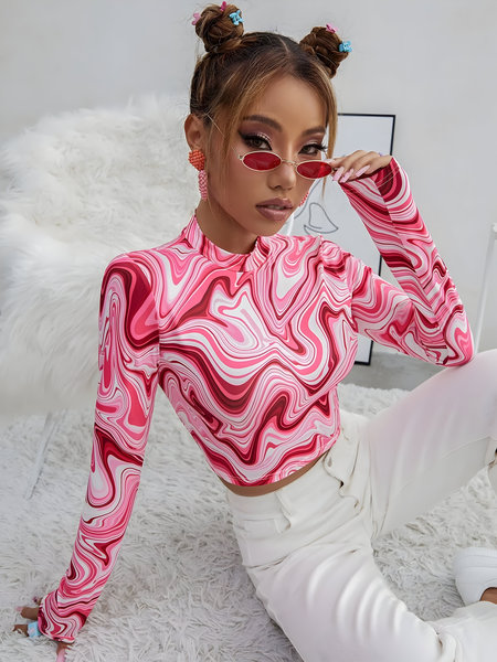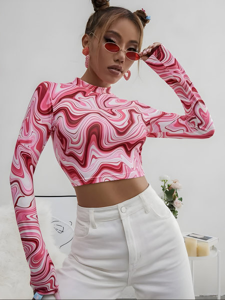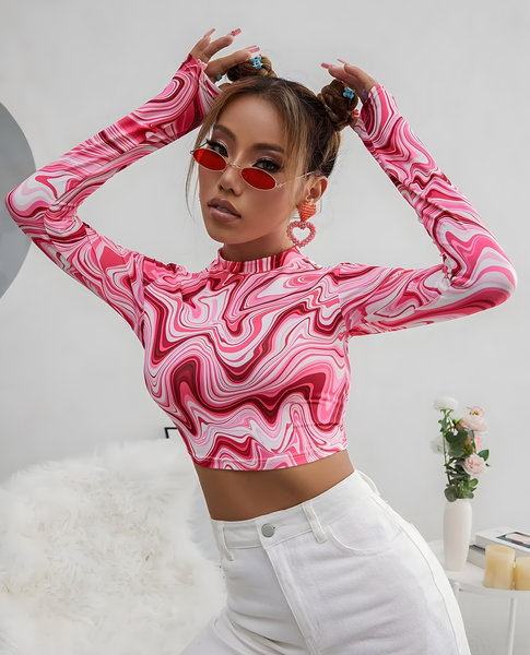 - Top: Eye-catching pink marble print crop top with a sleek, body-hugging fit.