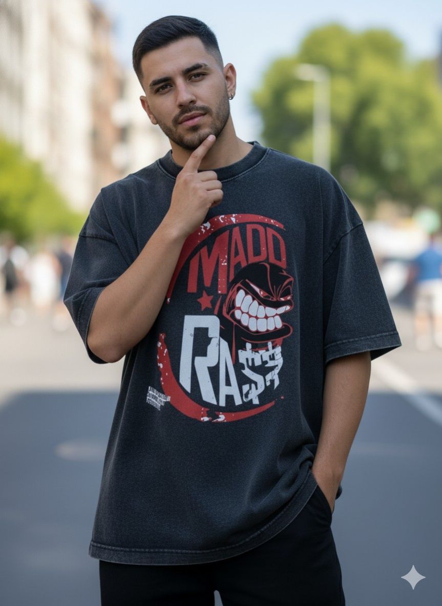 - Features a bold graphic with a fierce rasta-inspired face and "Madd Rasta" text in red and white, surrounded by a distressed circular design, exuding a vibrant, rebellious energy.