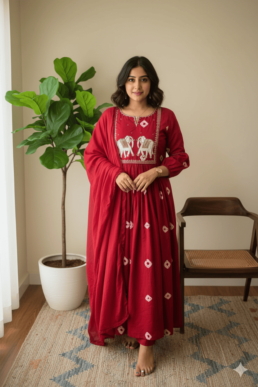 Color and Fabric: Features a vibrant maroon hue, likely in a cotton or rayon fabric for comfort and drape.