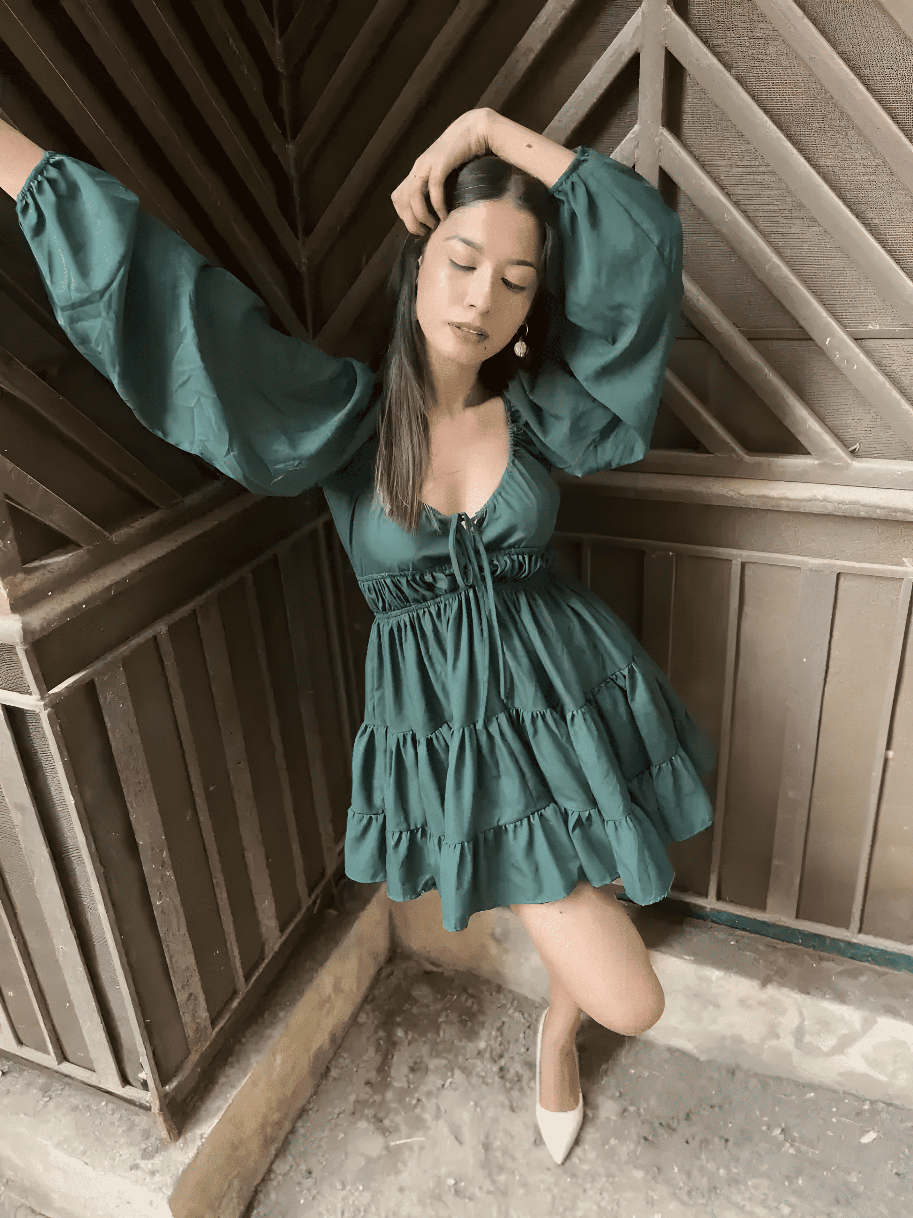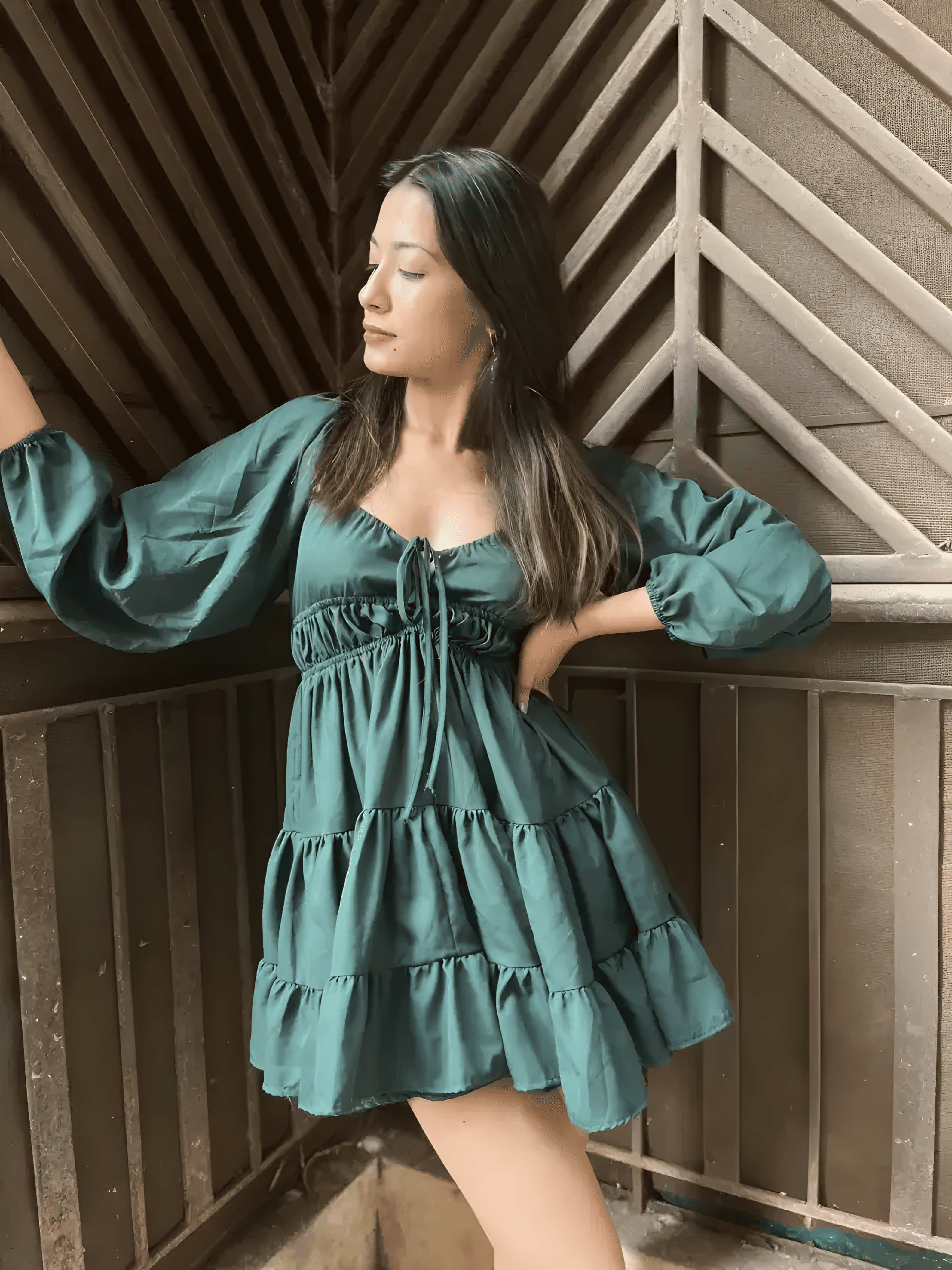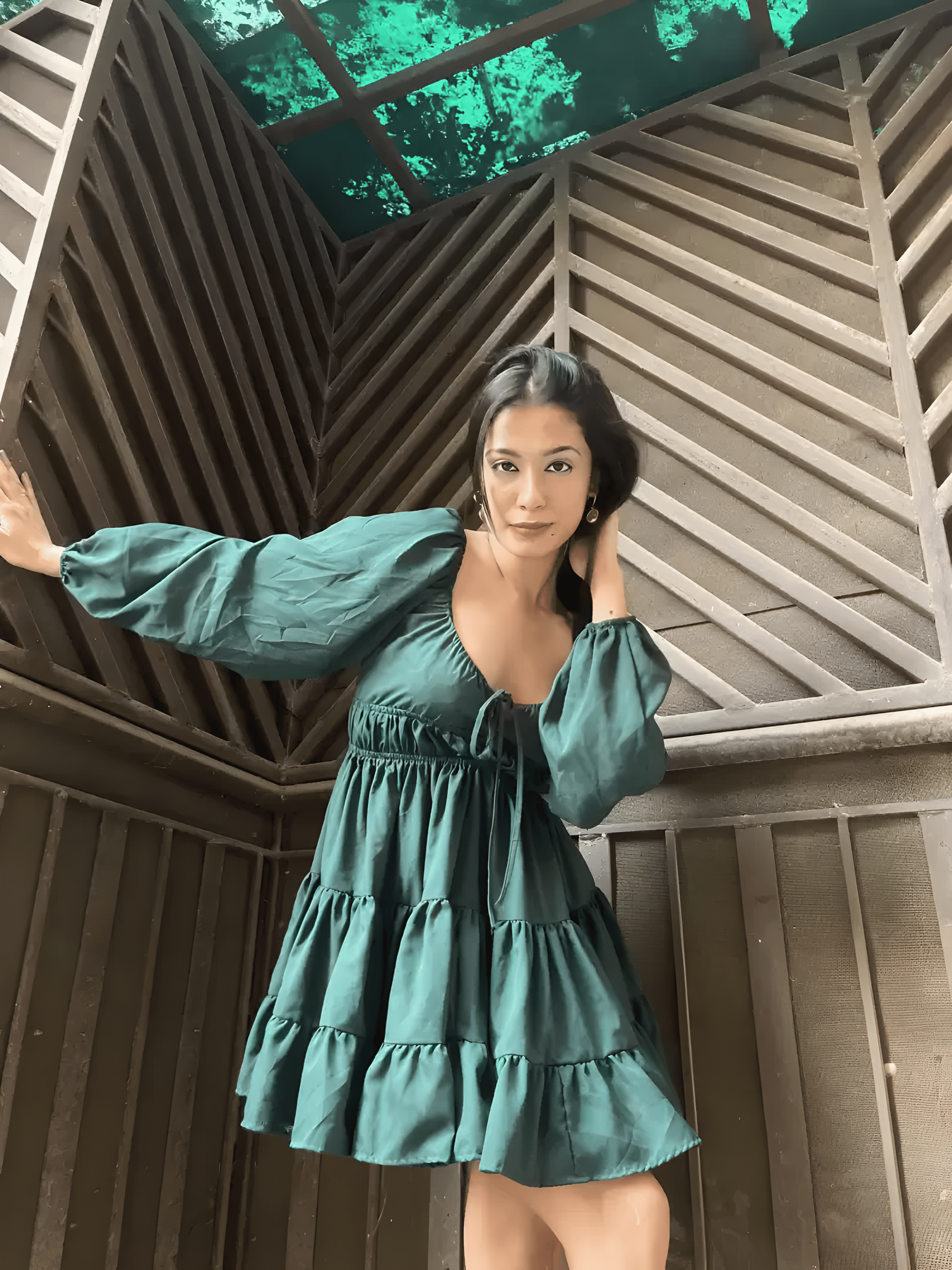 - Length: Mini dress with layered ruffle hem for a chic look.