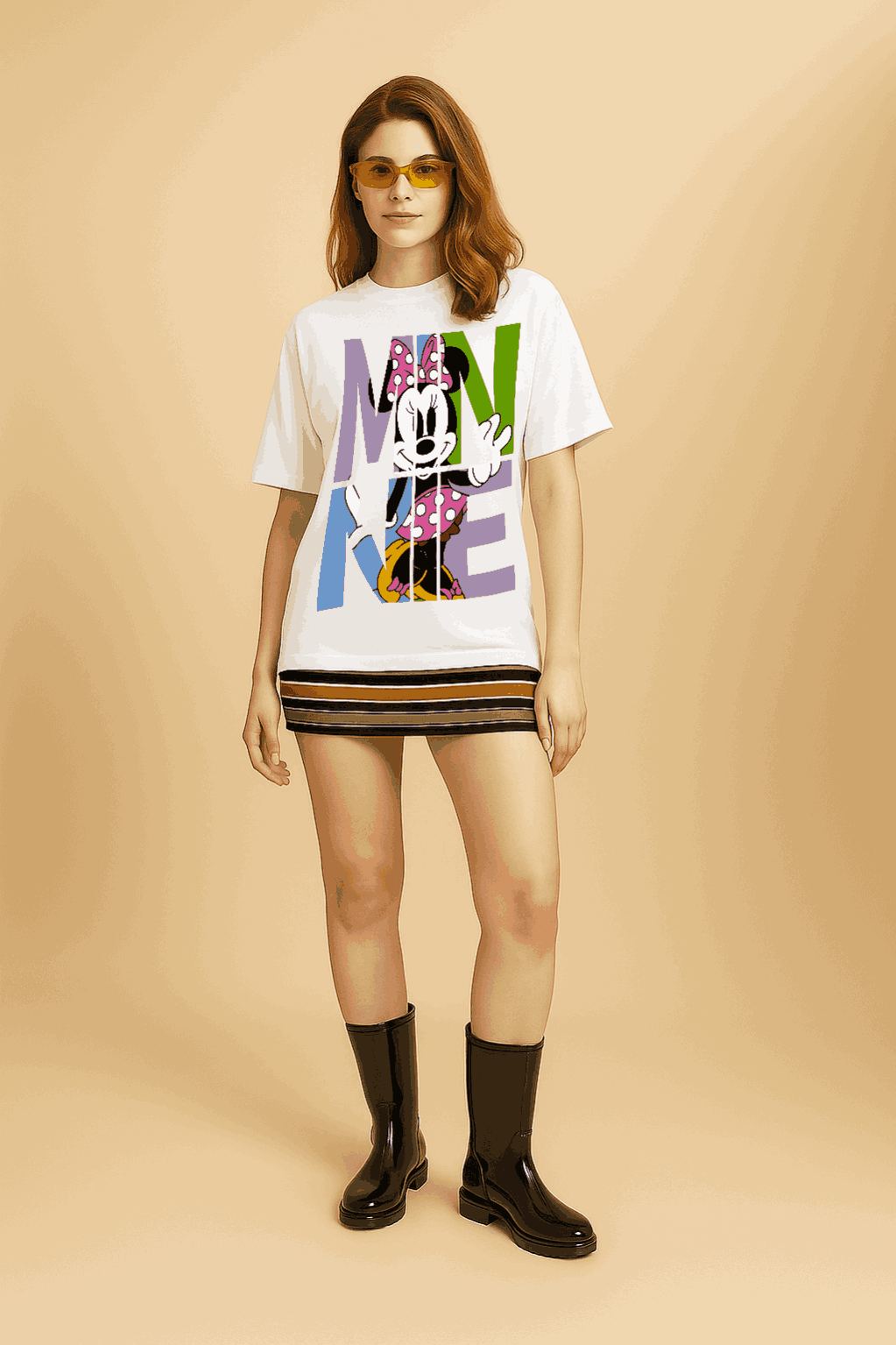 Features an adorable full-length Minnie Mouse graphic in her iconic polka-dot outfit