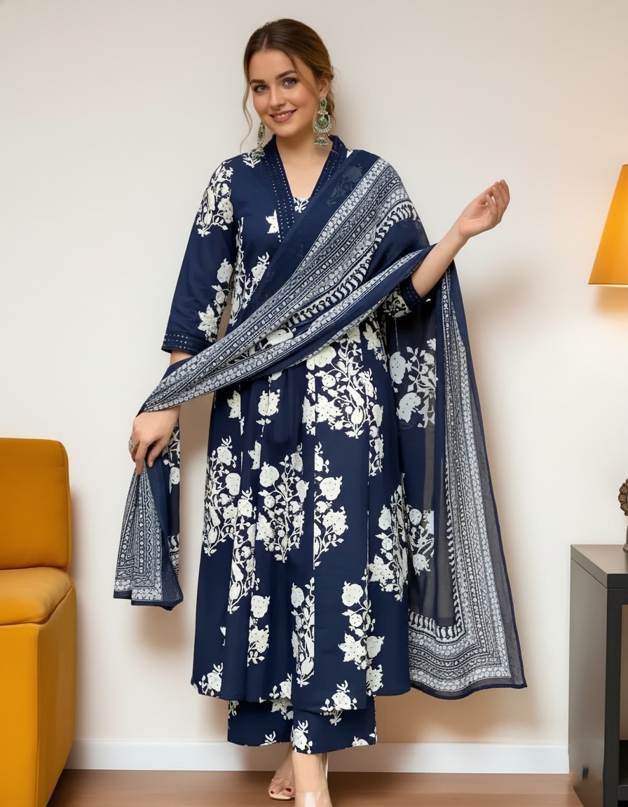 Elegant navy blue floral printed kurta set designed for modern women who love traditional style.
