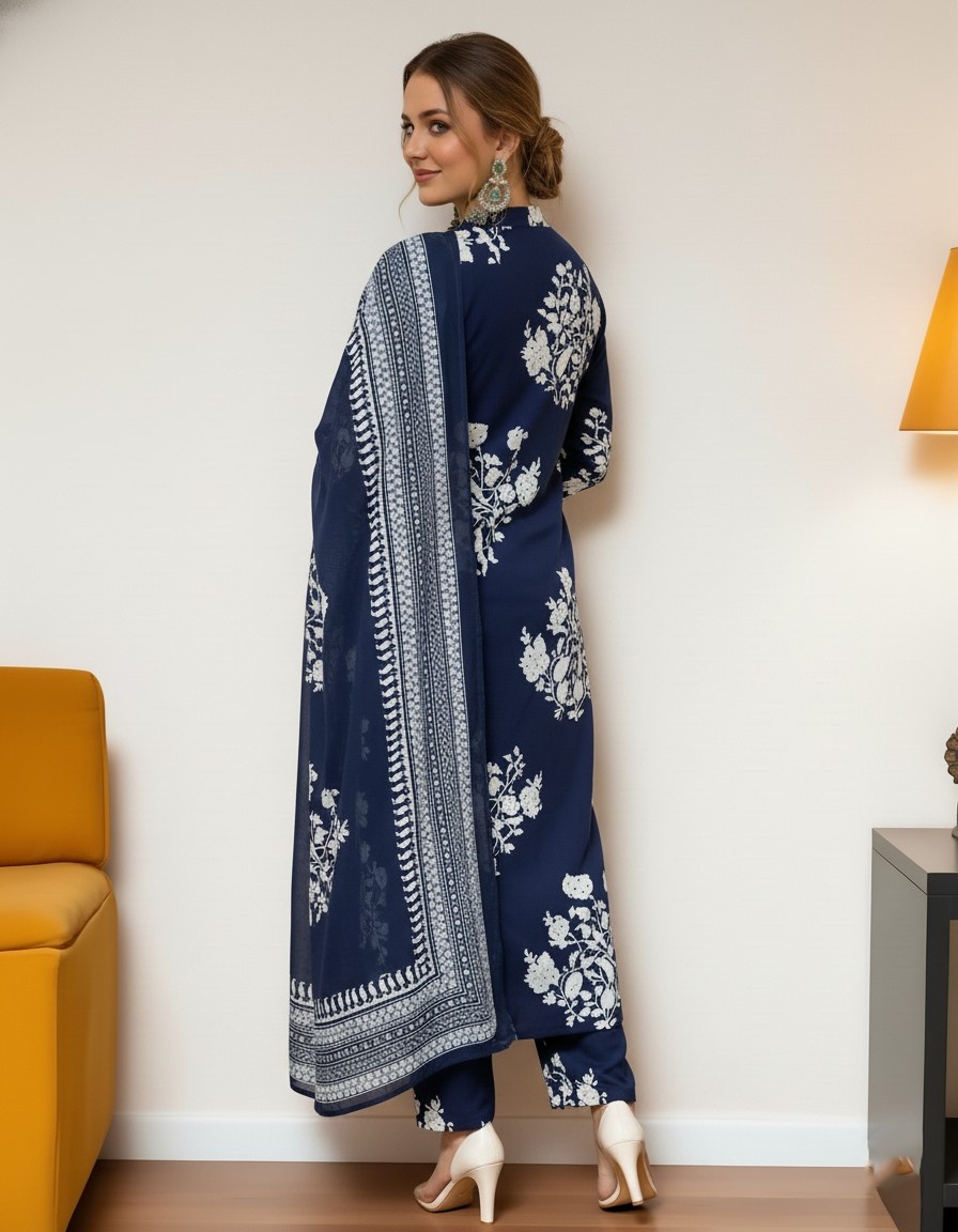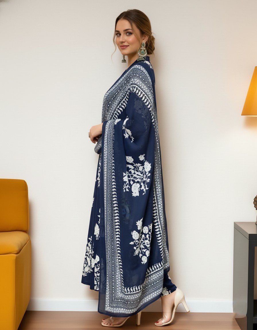 Navy Blue Floral Printed Kurta Set with Dupatta for Women