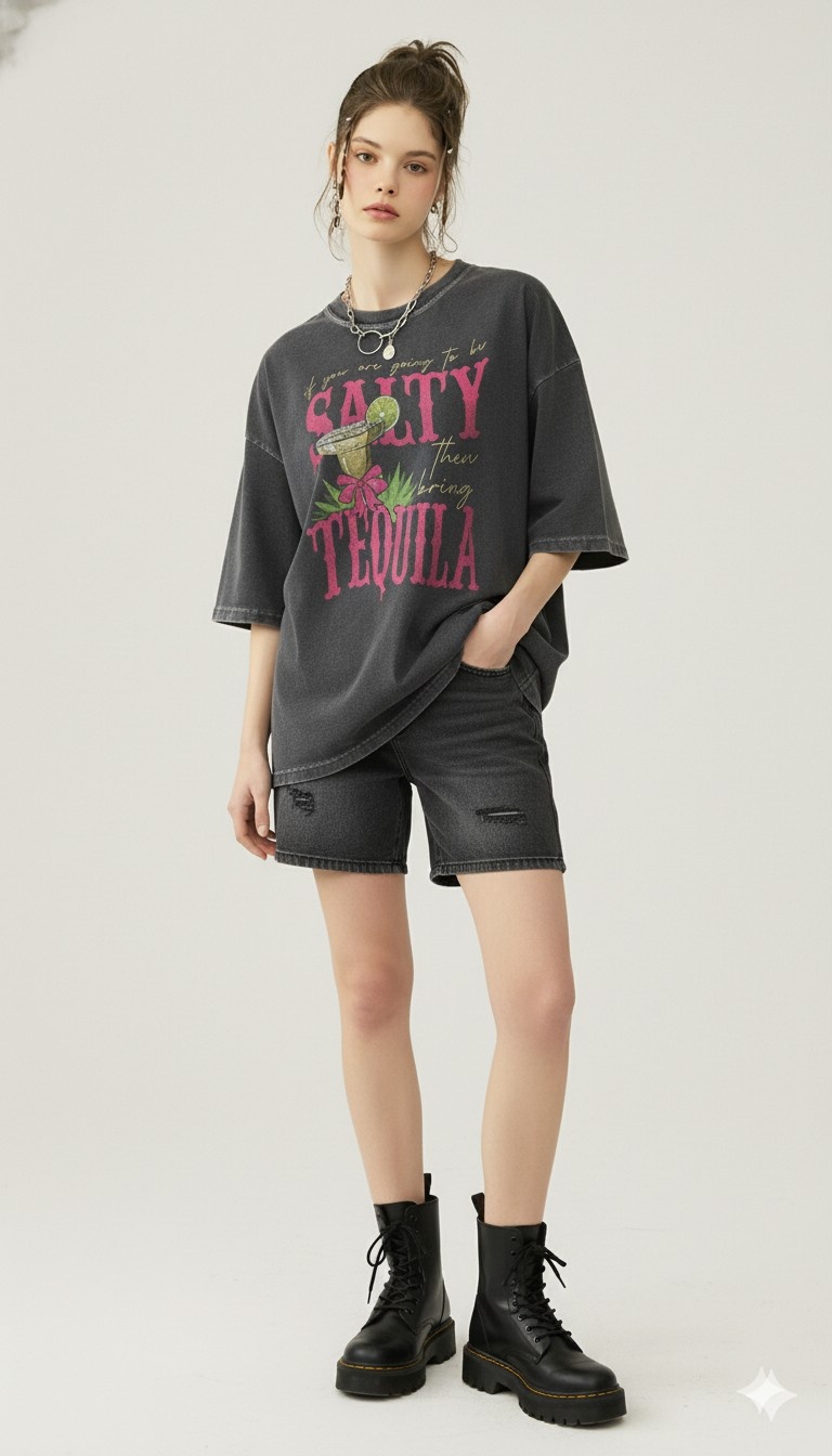 - Fiesta-Ready Party Aesthetic: Blends coastal cowgirl flair with Y2K humor — vibrant pink, gold, and lime green accents pop against the dark acid-washed canvas, ideal for brunches, beach days, or bar hops.