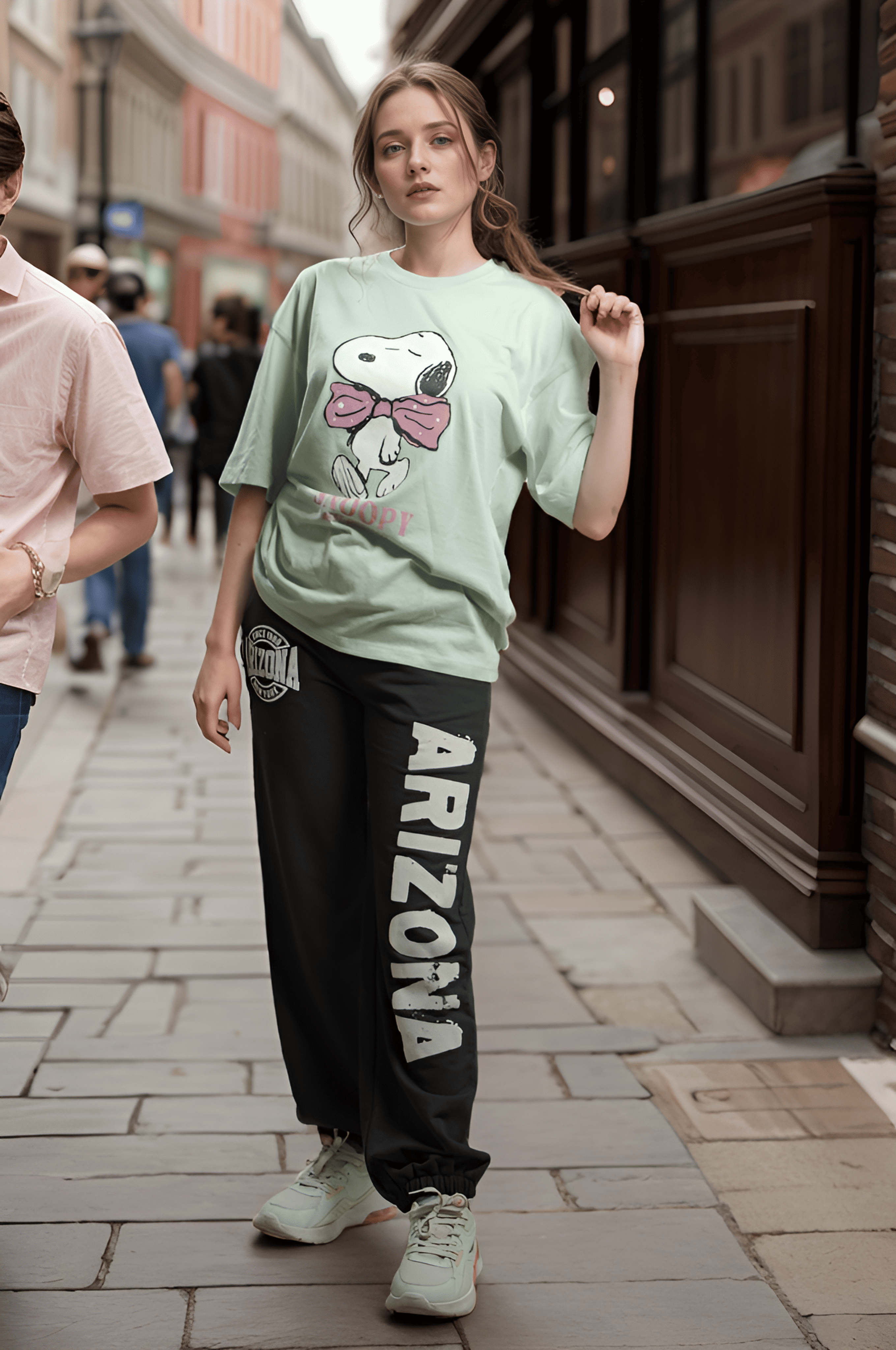 - Large front print of Snoopy with a pink bow, adding a cute and playful touch