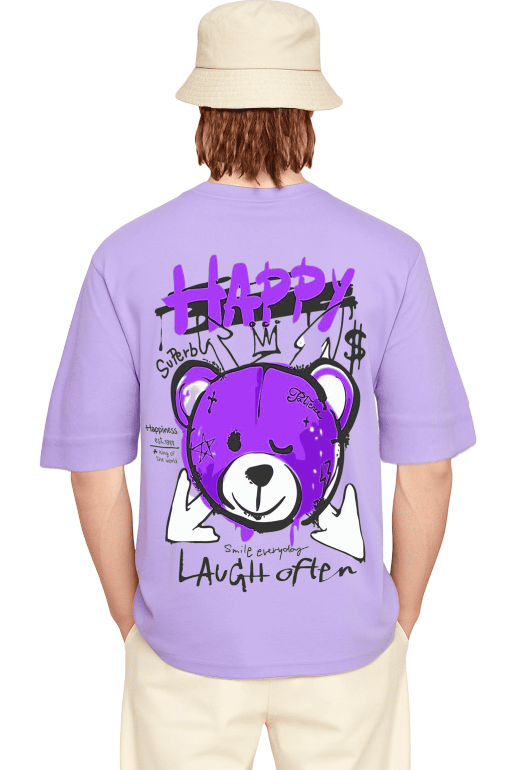 Oversized Streetwear Graphic Tee – “Happy Bear” Edition (Lavender)