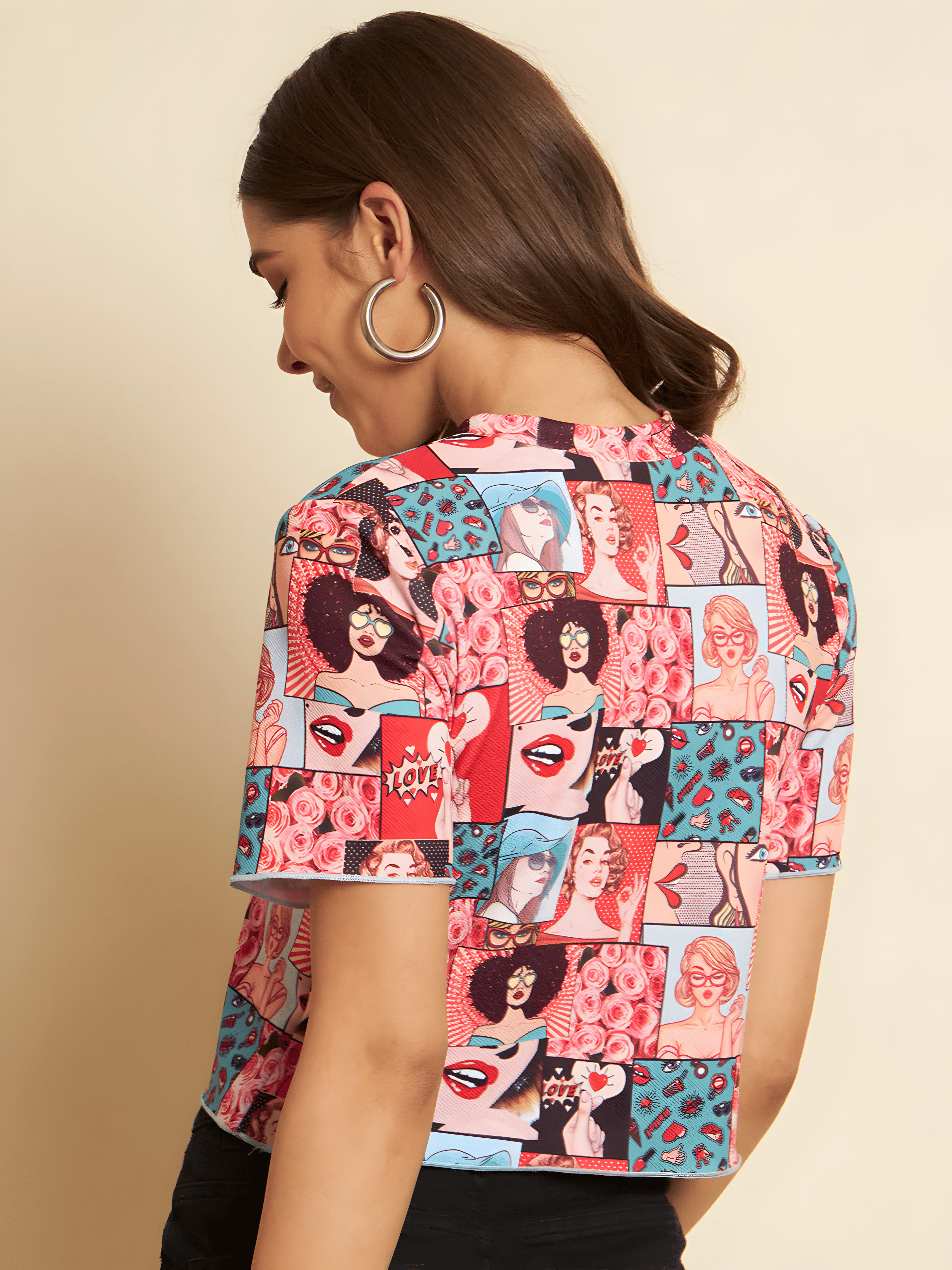 - Top: Vibrant pop art-inspired graphic print crop top with a playful mix of colors and patterns.